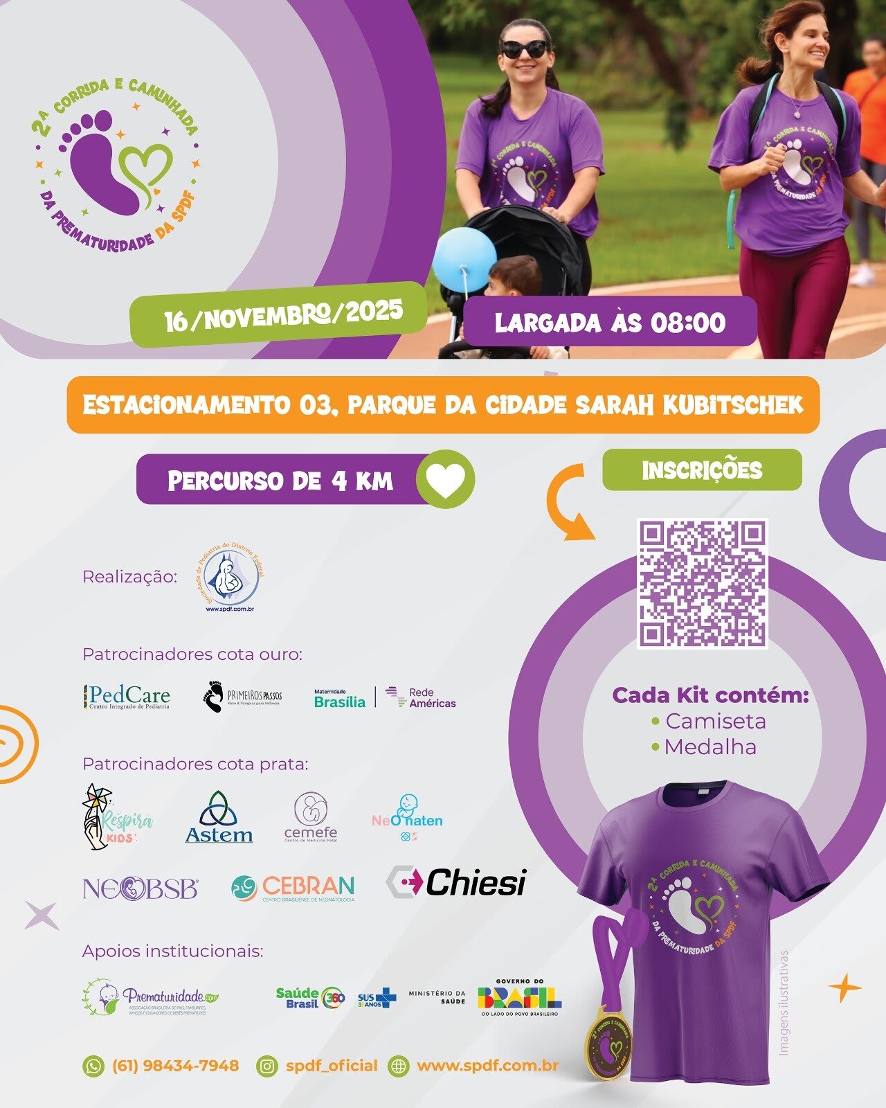 A manhã do domingo, 16/11, foi marcada por emoção, mobilização e informação no Parque da Cidade, em Brasília, durante a 2ª Corrida da Prematuridade, uma iniciativa da Sociedade de Pediatria do Distrito Federal (SPDF), com apoio da ONG Prematuridade.com e do Ministério da Saúde. O evento integrou a programação nacional do Novembro Roxo, mês dedicado à sensibilização sobre prevenção da prematuridade e cuidados com os bebês que chegam antes do tempo.