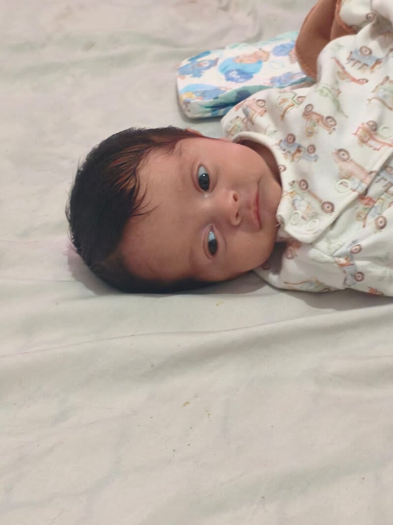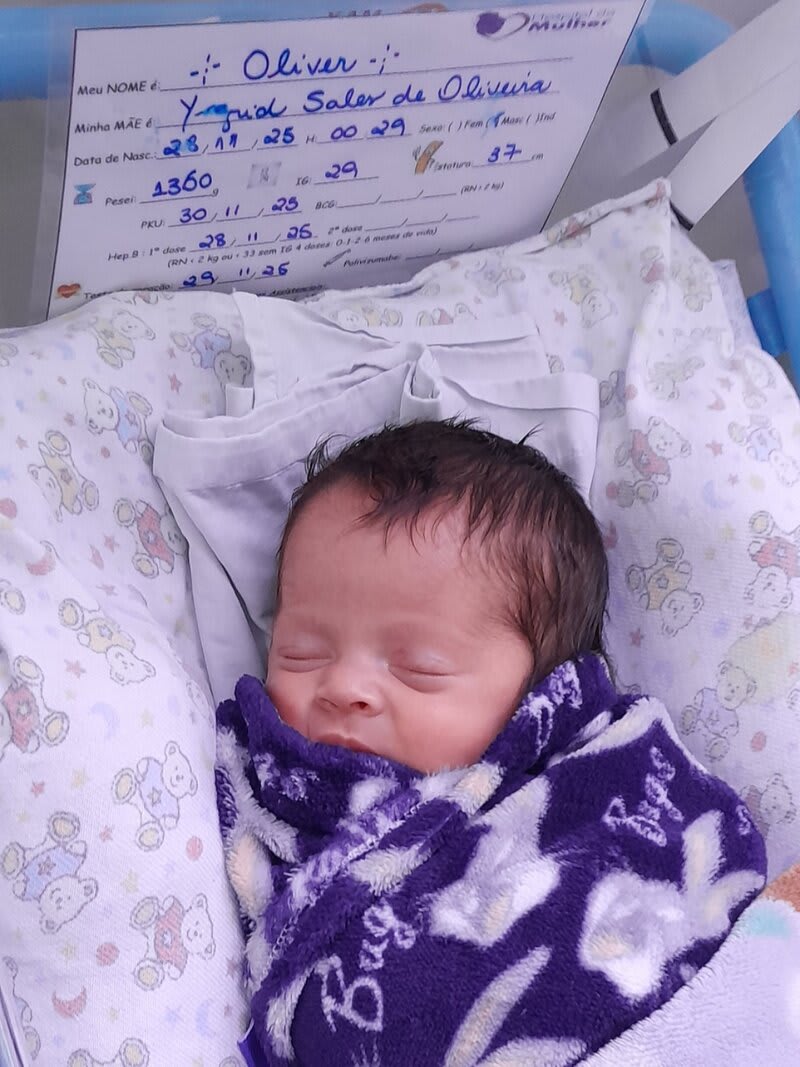 O Oliver nasceu no dia 28 de novembro de 2025, às 00:09, com apenas 29 semanas de gestação. Ele era muito pequeno, pesava 1.360 kg e media 37 cm. Assim que nasceu, precisou ir direto para a UTI Neonatal. Começava ali a fase mais desafiadora das nossas vidas. Ficamos 29 dias na primeira UTI. O processo foi cheio de etapas. Ele começou usando CPAP, depois precisou ser entubado, voltou para o CPAP e, aos poucos, conseguiu respirar em ar ambiente. Durante esse período, teve apneias, anemia da prematuridade e precisou receber uma transfusão de sangue. Cada dia era uma mistura de medo e esperança. Cada pequena melhora era uma vitória enorme.