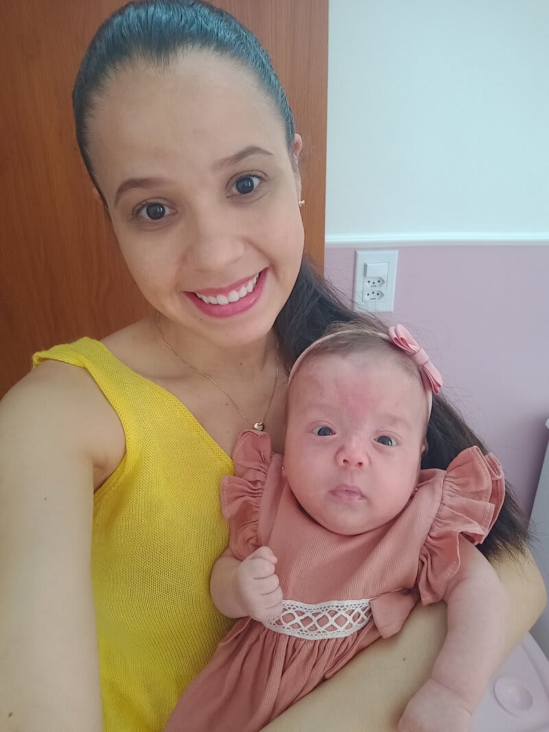 Minha filha se chama Lorena. Escolhi esse nome por achar que o significado é bem forte: famosa guerreira. Não imaginava que ela precisaria ser uma guerreira para lutar pela própria vida. Nasceu de 29 semanas e 6 dias, pesando 1kg. Pude segurá-la pela primeira vez após 04 dias de nascida. Lembro que só chorava de felicidade em poder pegar aquele pacotinho no colo, tão leve, mas tão forte! Precisou de 72 dias de internação e nesse período nossos corações foram testados. Apresentou quadro de sepse, infecções bacterianas, trombo extenso no coração após uso do Acesso Venoso Central, hemorragia cerebral que evoluiu até grau II e causou focos de Leucomalácia.