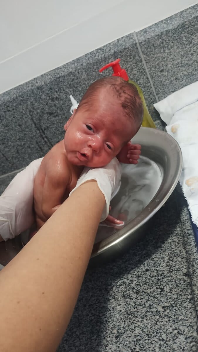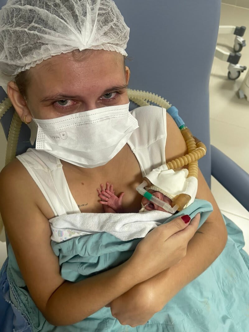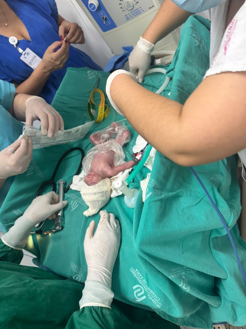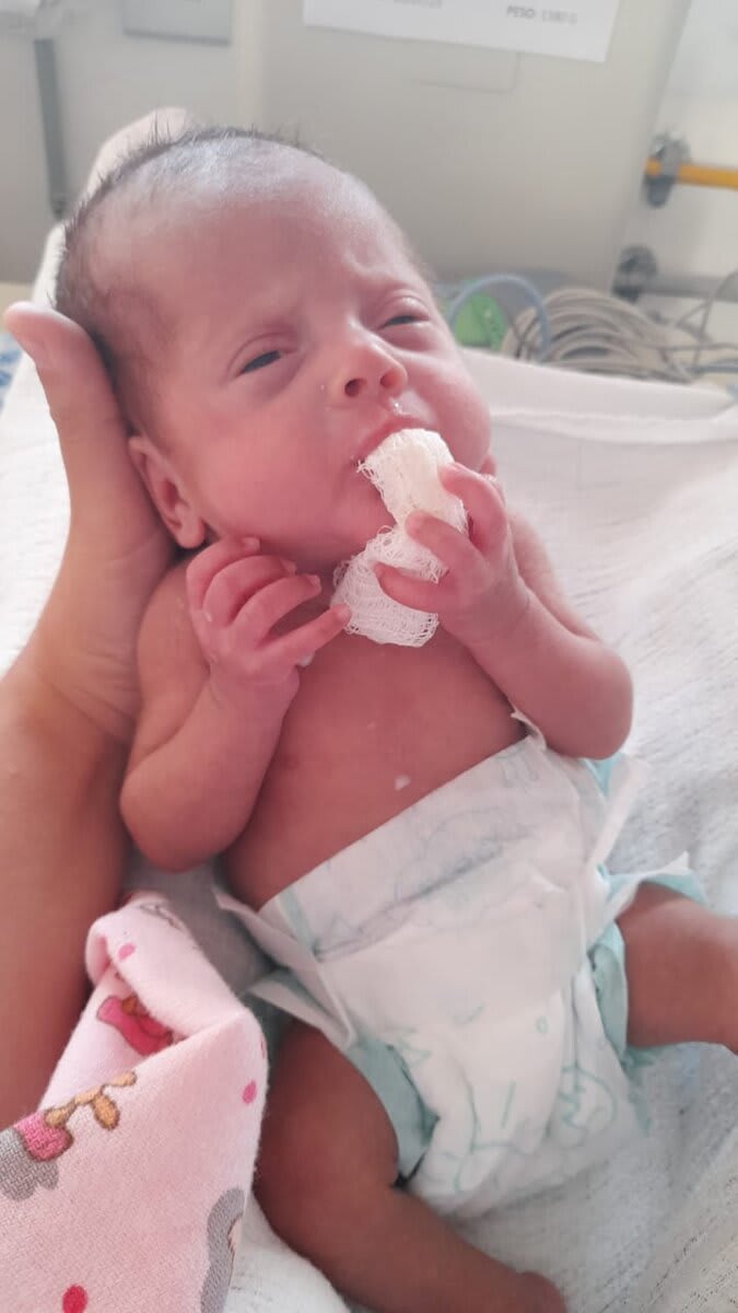 Duas semanas depois, a infecção reincidiu e migrou, causando corioamnionite, sepse e pré-eclâmpsia. Foi necessário fazer a remoção da cerclagem e uma cesárea de urgência! E então Iris Maria nasceu de 26 semanas exatas, no dia 27/05/25, pesando 870 gramas, chegando a 670 gramas após 3 dias de nascida.