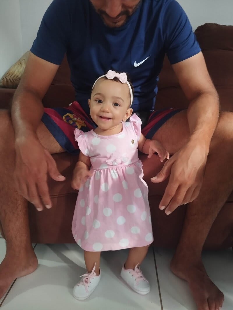 Hoje, faz fisioterapia e fonoaudiologia para reabilitação. Está com 1 ano e 2 meses, já fica em pé, mas ainda não se alimenta via oral.