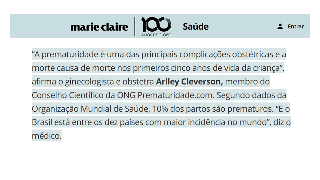 O ginecologista e obstetra Arlley Cleverson, membro do Conselho Científico da ONG Prematuridade.com, participou da reportagem da Revista Marie Claire, da Editoria Globo, que conta a história de uma mãe de prematuros. O Dr. alertou sobre os dados da prematuridade no Brasil - uma das principais complicações obstétricas e a principal causa de morte de crianças até cinco anos.