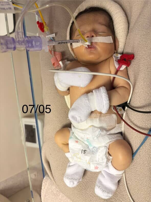 Ela foi direto para a UTI com desconforto respiratório e ficou com uso do CPAP. Acabou engolindo um pouco de líquido sanguinolento, ficou dois dias com a sonda aberta para sair todo aquele sangue que ela tinha engolido. Mas, com três dias de vida, começou a se alimentar e estava indo tudo bem, até que, com sete dias de vida, apresentou sangue nas fezes e um abdômen distendido. Ela foi entubada de forma eletiva, entrou em jejum e iniciou vários antibióticos.