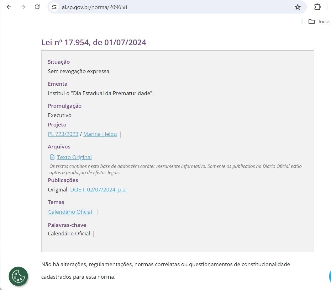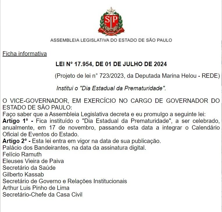 No dia 01 de julho de 2024 celebramos a promulgação da Lei nº 17.954, de 01/07/2024, que institui o "Dia Estadual da Prematuridade" em São Paulo.