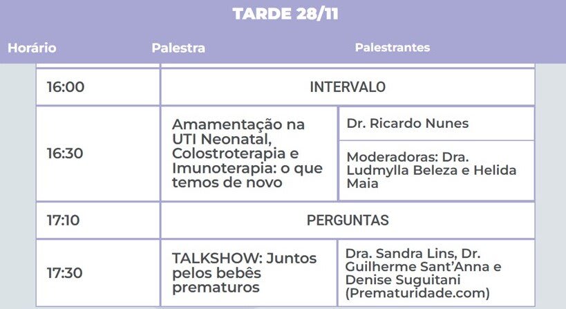 Dentre os speakers estavam a Dra Nicole Gianini, falando sobre porque precisamos priorizar a presença dos pais e o pele a pele e suas bases científicas, Dr Gabriel Altit, do Universidade McGill do Canadá, abordando cuidados cardiológicos do prematuro, Dr Jorge Afiune e os membros do Conselho Científico da ONG, Dr Gabriel Variane e Dr Guilherme Sant'Anna, dentre outros profissionais da equipe interdisciplinar de excelência.