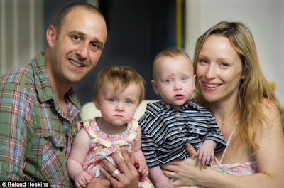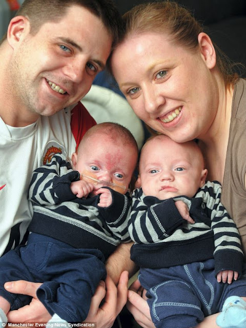 | Os pequenos Billy (à esquerda) e Kaydon, no colo dos pais Gareth e Kelly (mesma fonte) |