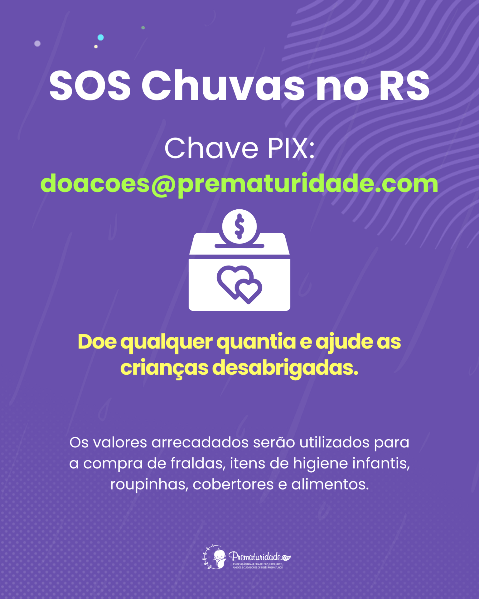 Diante da maior catástrofe climática na história do estado do Rio Grande do Sul, estamos mobilizados para ajudar bebês prematuros e suas famílias que estejam desalojados ou necessitando de atendimento, medicamentos e equipamentos em casa ou em abrigos, assim como para apoiar a manutenção da assistência à saúde de bebês internados nas UTIs neonatais do estado.