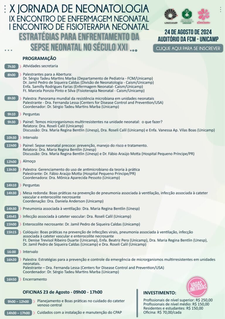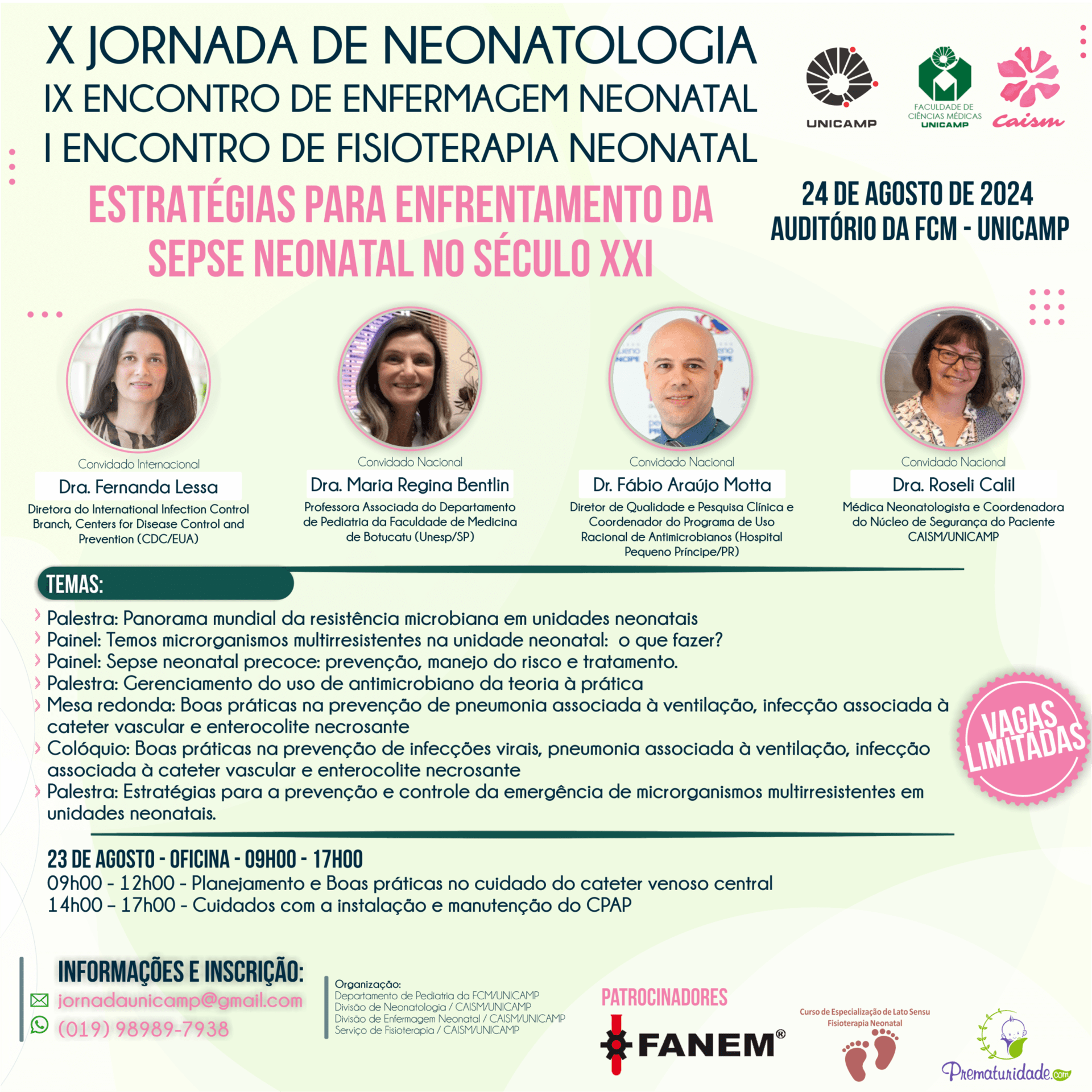 Aconteceu nos dias 23 e 24 de agosto de 2024 a X Jornada de Neonatologia, IX Encontro de Enfermagem Neonatal e I Encontro de Fisioterapia Neonatal do CAISM (UNICAMP), em Campinas, São Paulo.