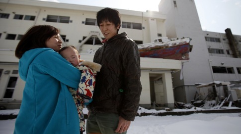Kenji Sato, de 31 anos, ao lado da mulher Hiromi, de 34, com Haruse ao colo (foto YURIKO NAKAO/REUTERS) |