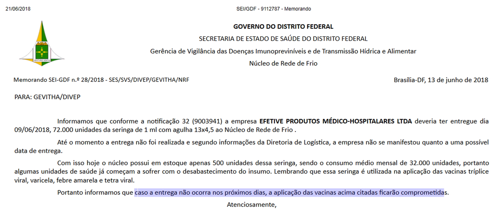 Sobre a situação, a Saúde diz que as seringas já foram adquiridas, mas a empresa vencedora da licitação "atrasou a entrega do insumo".