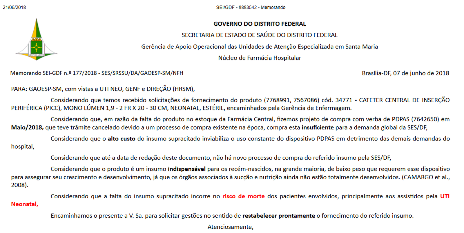 O texto, datado do último dia 7, foi assinado pelo chefe do Núcleo de Farmácia Hospitalar da unidade. No documento ele diz que a falta do insumo "incorre no risco de morte [sic] dos pacientes envolvidos", principalmente os bebês que estão internados na UTI neonatal.