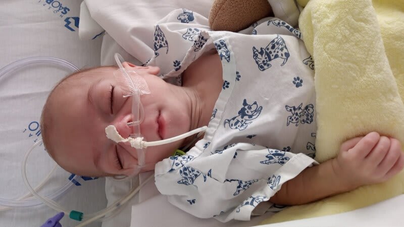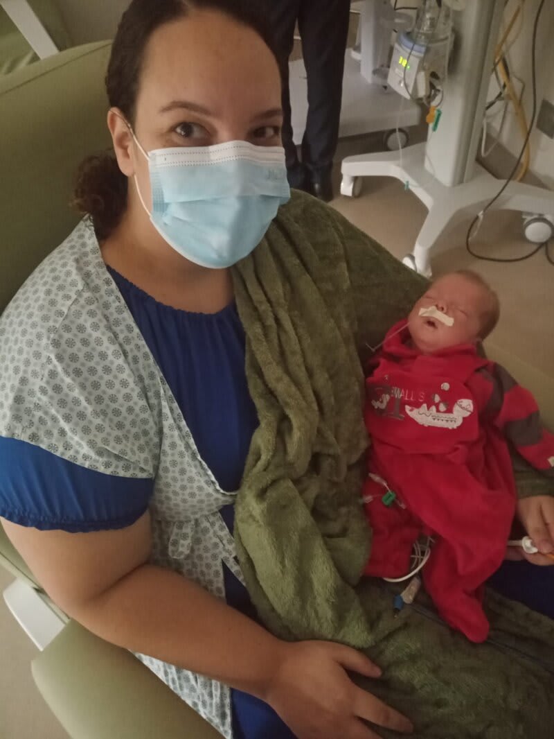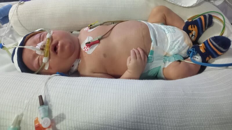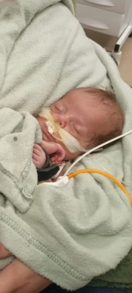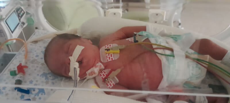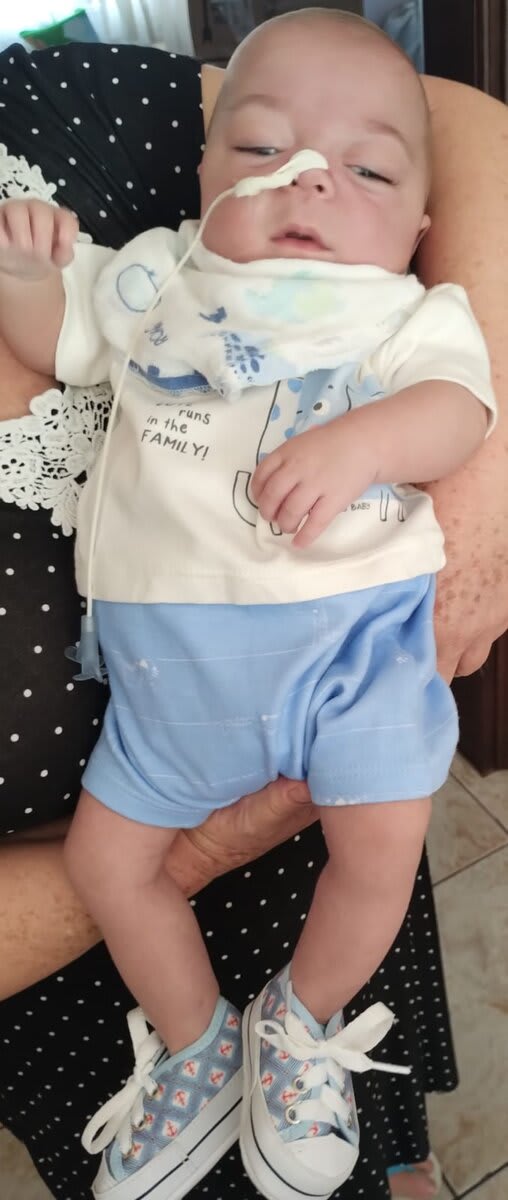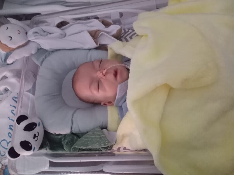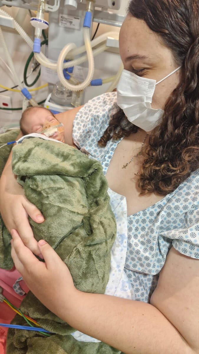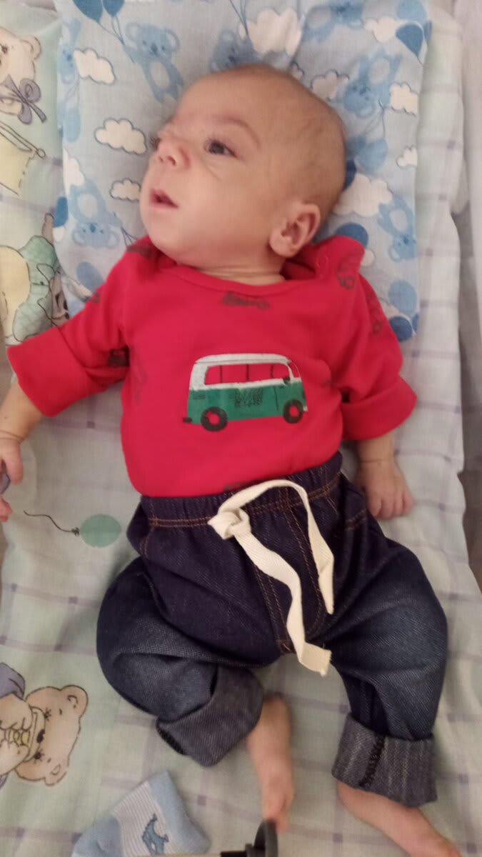 Ele deu um chorinho quando nasceu mas não pude pegá-lo, já correram com ele, colocaram na incubadora e levaram para a UTI neonatal. Tive sepse precoce, ele recebeu surfactante nas primeiras horas de vida, anóxia, choque séptico, ventriculomegalia qualitativa bilateral, icterícia neonatal tardia, anquiloglossia, crise convulsiva, sepse tardia em 02/02, enterocolite necrotizante, etc. Tomou adrenalina, ficou 40 dias de jejum, teve meningite e apresentou complicações da prematuridade, necessitou de abordagem cirúrgica devido à enterocolite necrosante e sepse tardia. Recebeu alta da enfermaria pediátrica dia 19/06, veio para o hospital da Unimed São José do Rio Pardo, retirou a sonda e já estava mamando até no peito. Já estava quase de alta, só que infelizmente por descuido dos profissionais ele teve COVID-19 e acabou sendo transferido para Ribeirão Preto novamente. Internou novamente dia 12/07 até dia 01/08. Por infecção por COVID-19 teve disfagia e desnutrição. Veio pra casa dia 01/08 a noite. Hoje é meu milagre e está cada dia mais forte e mais guerreiro, Deus e Nossa Senhora Aparecida, sempre proteja você meu amor. Mamãe e Papai te amam!