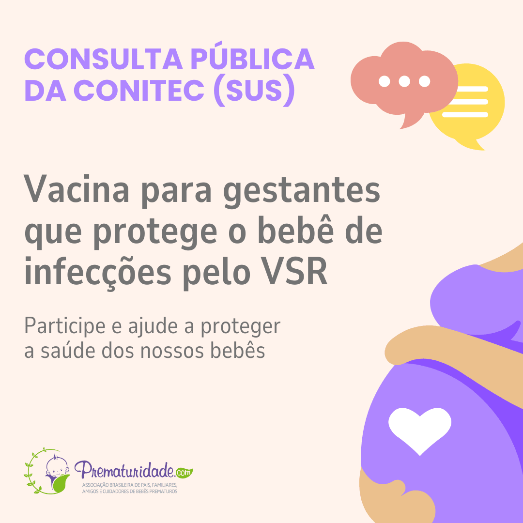 Contribua com a consulta pública, acessando: https://www.gov.br/participamaisbrasil/consulta-publica-conitec-sectics-n-95-vacina-virus-sincicial