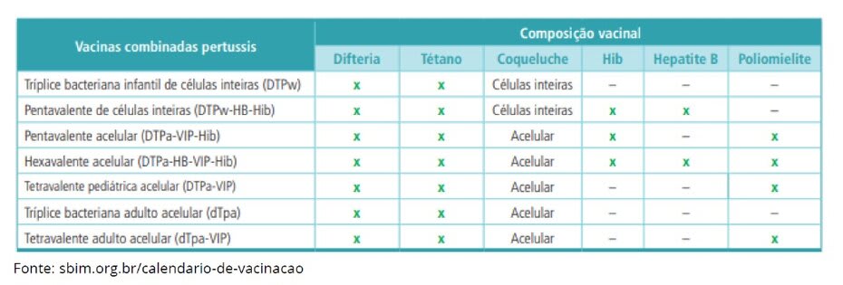• Vacina combinada com componente coqueluche de células inteiras (DTP) pentavalente, incluindo proteção para difteria, coqueluche, tétano, hepatite B e Haemophilus influenza tipo b. Esta vacina está disponível somente no SUS como rotina.