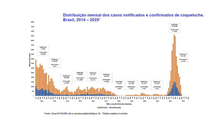 Uma importante característica da doença, é que a imunidade conferida pela infecção natural e pela vacinação, não é duradoura, favorecendo a ocorrência, de tempos em tempos, de um aumento de casos, fruto do acúmulo de suscetíveis. Vale destacar que algumas alterações da bactéria, melhorias do padrão de notificação e baixas coberturas vacinais podem também contribuir para eventual incremento de casos5.