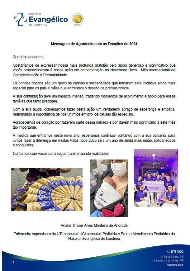 Em novembro de 2024, através de uma ação organizada pelo voluntário da ONG, o enfermeiro Guilherme Alves, doamos malhas para confecção de faixas usadas pelos pais de prematuros na realização da posição Canguru, ou contato pele a pele, na Unidade Neonatal do Hospital Evangélico de Londrina, no Paraná.