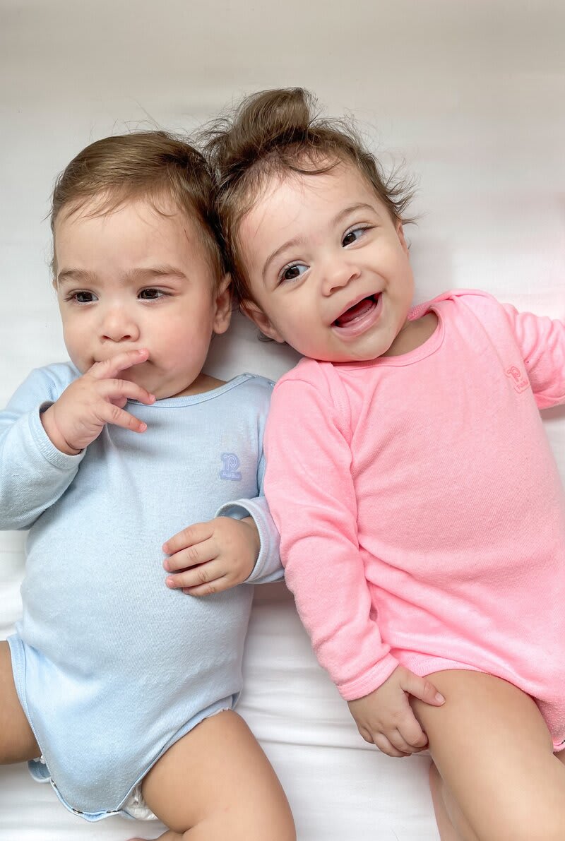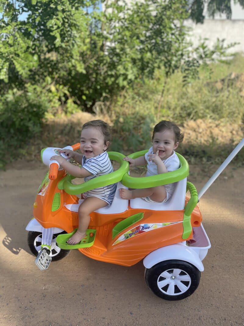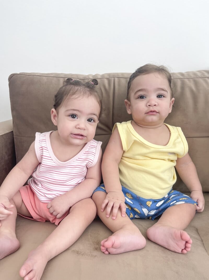 Me chamo Luana, tive uma gravidez gemelar induzida por FIV. Com 22 semanas de gestação descobri que estava com meu colo uterino com comprimento reduzido, precisei fazer várias restrições e ficar de repouso absoluto. Com 31 semanas e 5 dias Antônio (gemelar 1) entrou em sofrimento fetal, comecei a perder muito líquido e sangrar bastante, precisei fazer uma cesária de emergência. Antônio ( G1) nasceu com 1.705kg e 39 cm Maria (G2) nasceu com 1.365kg e 38 cm. Os dois passaram 34 dias de UTI, ambos tiveram apneias, icterícia, passaram por transfusões sanguíneas e dificuldades de ganhar peso por conta da regurgitação. Foram dias difíceis, uma verdadeira montanha russa. Graças a Deus hoje os dois são saudáveis e muito espertos!