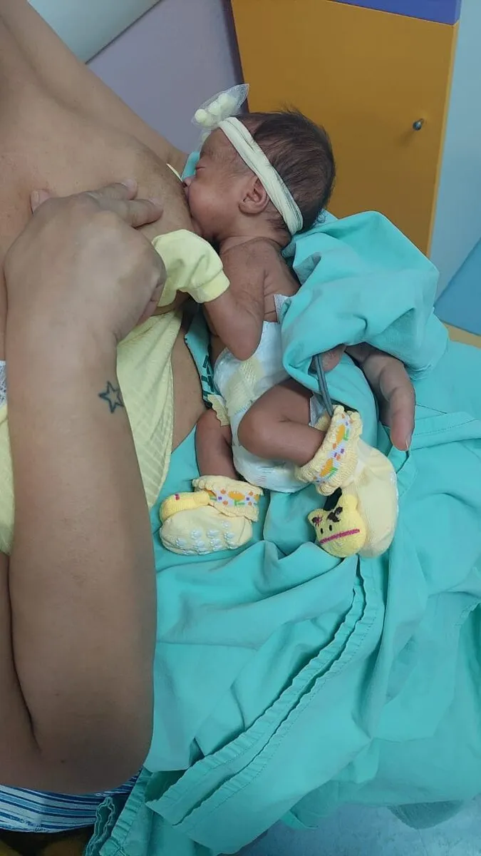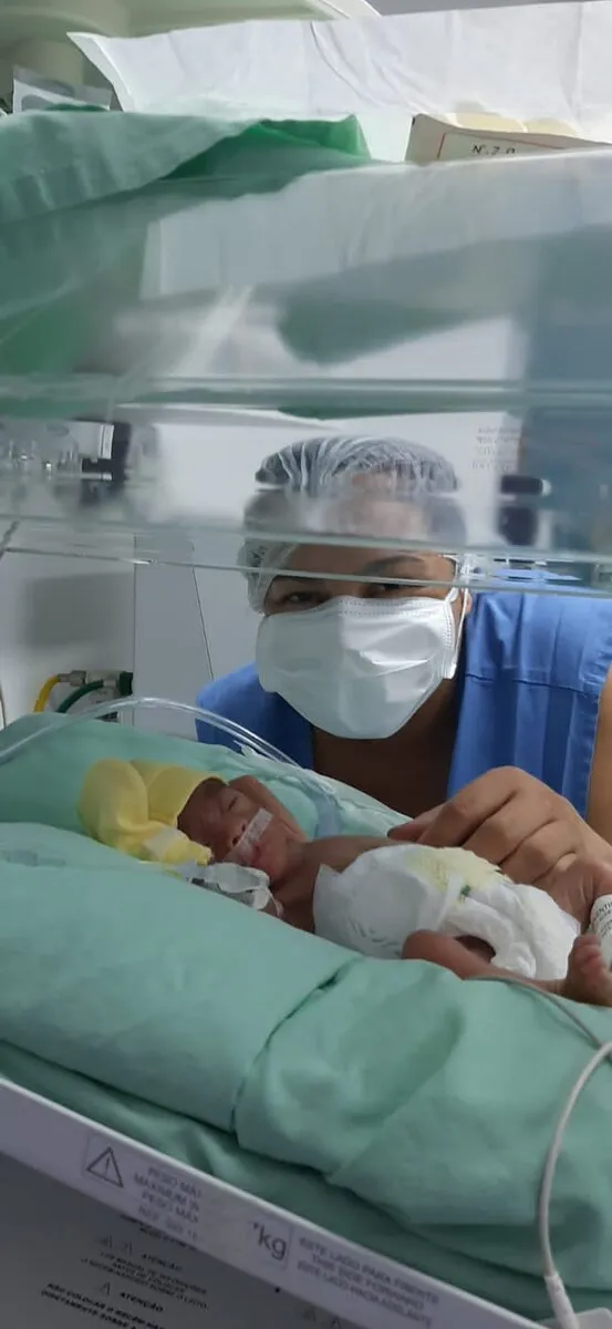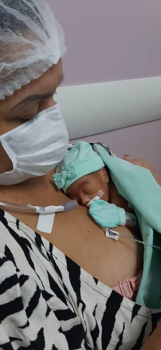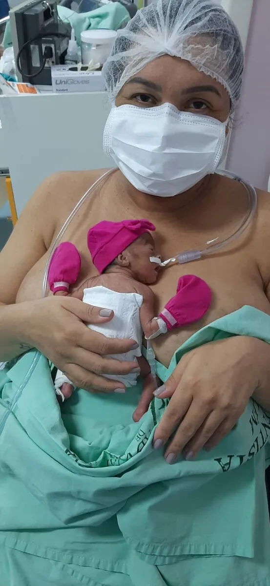 Entretanto, por volta das 27 semanas já estava perdendo muito líquido, e a bebê começou a entrar em sofrimento. Dessa forma, precisamos fazer um parto de urgência, e assim a minha pequena guerreira Esther nasceu com 830 gramas e 34 cm, e ficou no tubo por volta de 3 hs.