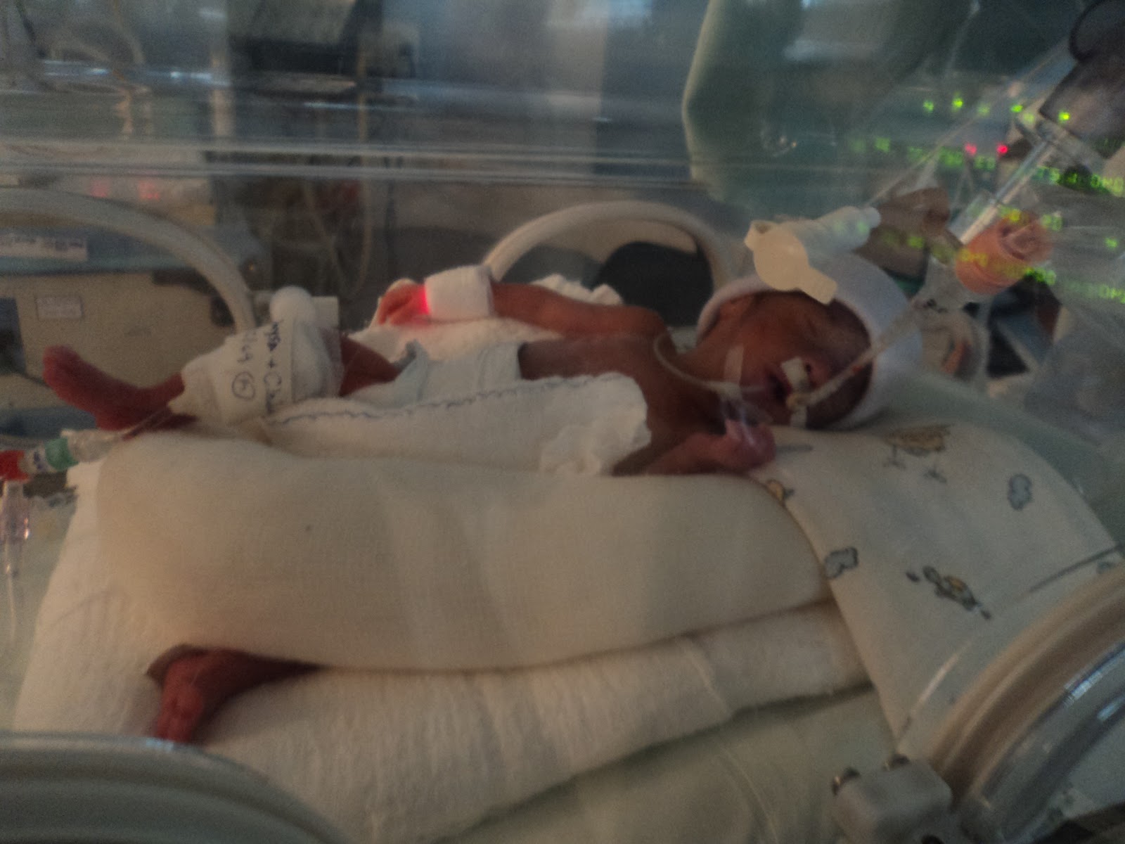 Duas semanas depois, no dia 31 de agosto, fui fazer uma dopplerfluoxometria e o médico me orientou a ir para o hospital, pois estava praticamente sem líquido e minha pequena estava em sofrimento. No hospital, após outra doppler, soube que realmente teria que fazer um parto de emergência. Às 17h30, minha pequena nasceu com 765 gramas e 31,5 centímetros. Quando o pediatra a trouxe para dar um beijo, chorei, mas ela não. Era muito pequena e frágil... Minha irmã foi avisar meu marido que a Yasmin tinha nascido. Assim que chegou, ele pode cohecê-la, já na UTI, enquanto eu estava na observação. Só pude ver minha filha no dia seguinte, pois eu ainda não conseguia andar por causa da cesárea.