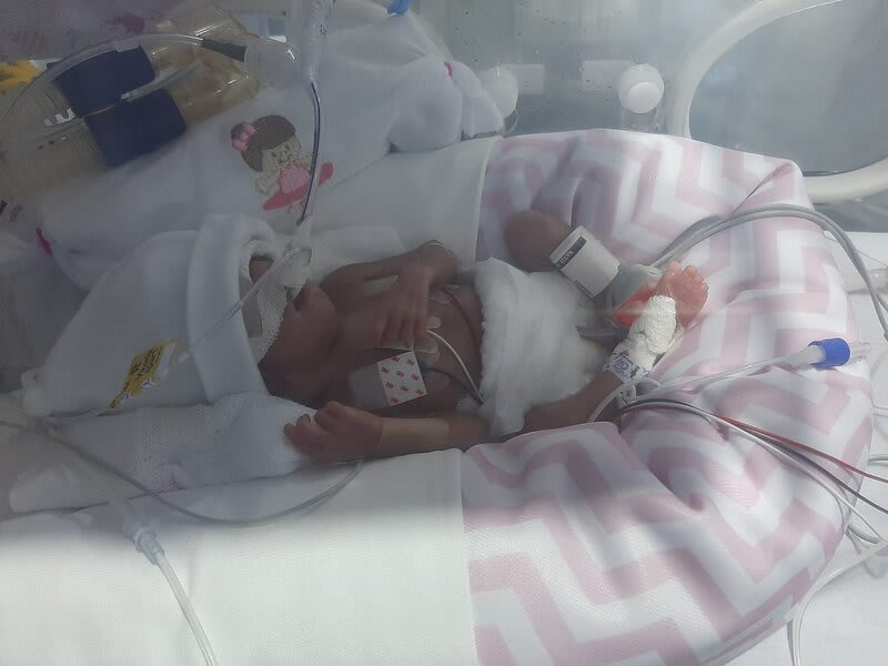 Mamãe não conseguiu te ver direito porque você tinha que ser entubada e ser levada para Utin. Eu e seu pai tivemos medo, e assim foi, primeira semana você seguia estável, oxigênio em 21%, até que começaram as quedas de saturação, foi aí que tudo começou. Vou falar resumindo tudo que ela teve quando estava na utin. Síndrome do desconforto respiratório, pneumotórax, icterícia, forame oval pérvio, anemia multifatorial sendo feito 10 transfusões de sangue, sepse tardia, hemorragia intraventricular, apneia da prematuridade, instabilidade hemodinâmica, insuficiência renal aguda, enterocolite necrosante (podendo vir a óbito a qualquer momento), colestase, síndrome de abstinência a medicação, crise convulsiva sintomática, retinopatia da prematuridade, doença pulmonar crônica da prematuridade e desnutrição e passou por 2 cirurgias e 1 procedimento.