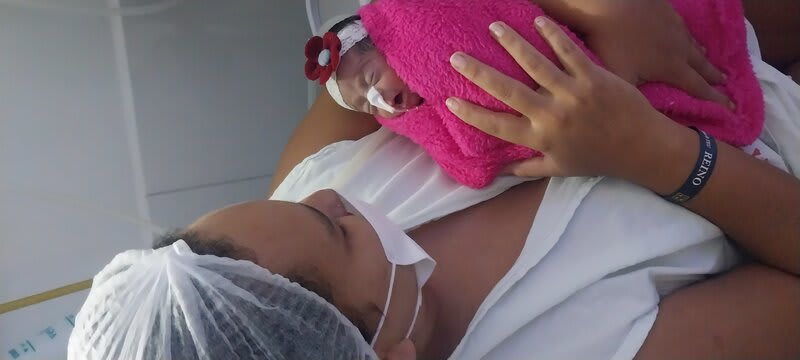 Minha gravidez foi tranquila até o 5° mês de gestação, após isso senti muitas dores e fui até a maternidade então no dia 03/12/2023 fiz uma cerclagem para segurar minha Maria por mais um tempo, mas na semana seguinte cheguei na maternidade com muitas dores e o diagnóstico foi colo do útero curto, após 11 dias internada e várias tentativas de segurar mais um pouco meu bebê.