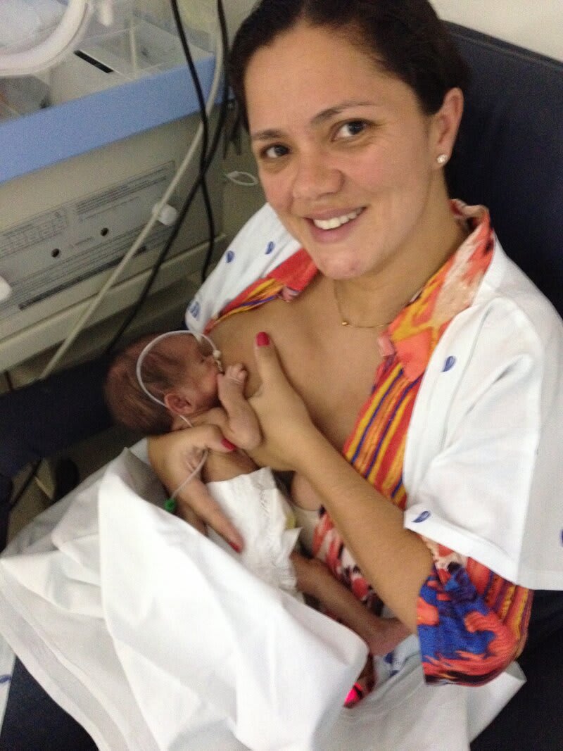 Em 2015 vivi um parto prematuro. Hadassa nasceu com 1.300kg e ficou na UTI por 35 longos dias. Em todos esses dias eu ia ao hospital ordenhar e ela mamava o leite materno pela sondinha. Foram dias de dor e muito sofrimento para mim. A dor da cesárea eu nem senti porque a dor em meu coração era muito maior em ter que deixar minha tão pequena filha sozinha naquele hospital. Todos os dias eu a visitava e cantava para ela fazendo carinho em sua mão porque não podia pegá-la no colo. Com 24 dias ela veio para meu colo para aprender a mamar no peito e graças a Deus aprendeu rapidinho. Com 35 dias foi pra casa mamando no peito e mamou até 1 ano. Manter a produção de leite foi desafiador, mas eu lutei até o fim para que ela fosse amamentada! Cada dor, lágrima e sofrimento não se compara com a alegria de vê-la crescendo forte, inteligente, alegre e muito grata. Se você está lendo essa mensagem e passa por esse desafio, não se desespere. Confie em Deus e não desista!