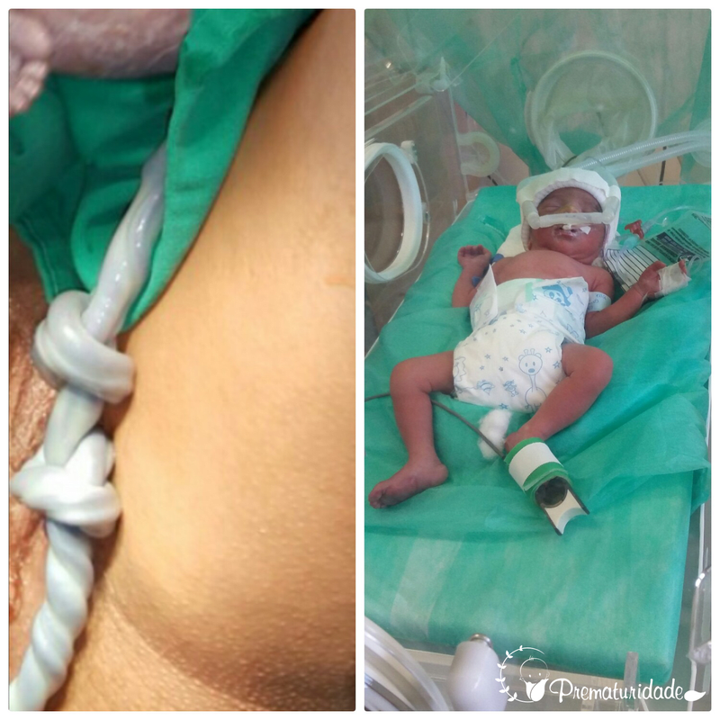 Pois é, mas a dor só piorava e dentro de algumas horas a médica voltou a examinar e falou: "Nossa, você evoluiu um trabalho de parto muito rápido!". Fomos ao centro cirúrgico e lá o Miguel nasceu. Um verdadeiro milagre! Em um parto normal, a médica teve a maior surpresa: dois nós verdadeiros no cordão umbilical. Isso mesmo. Dois nós e o bebê está vivo!