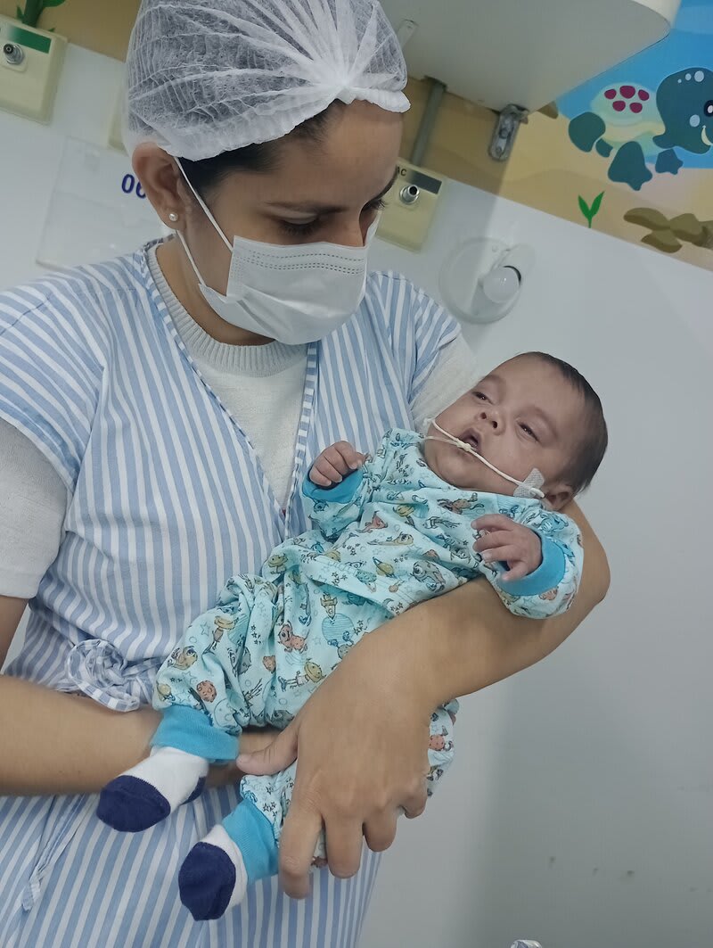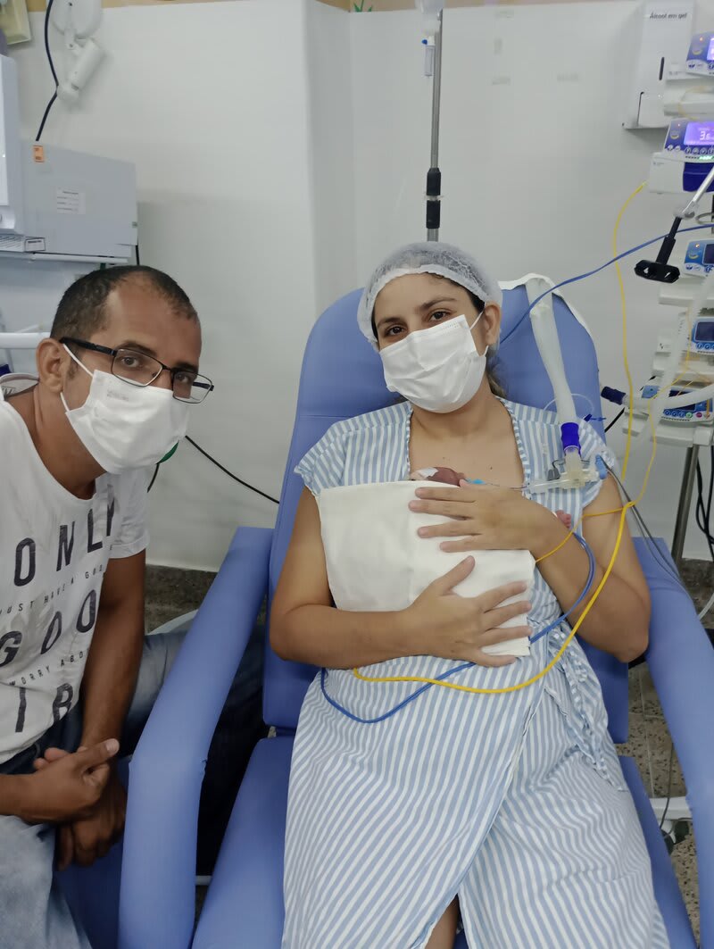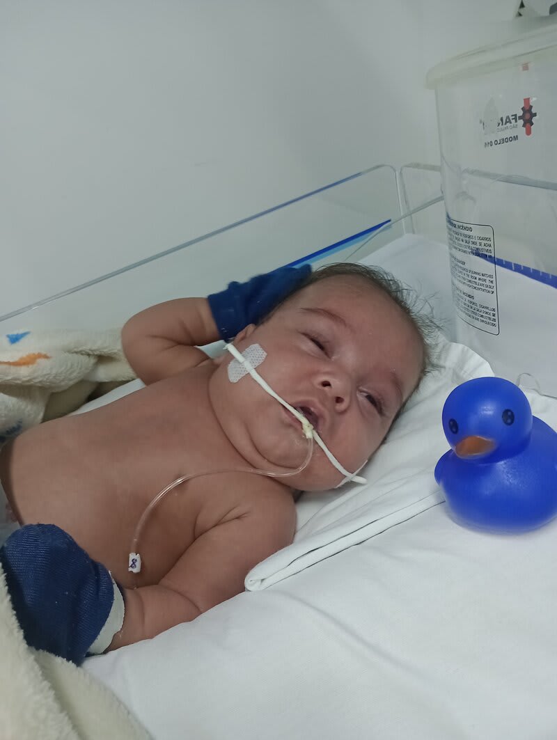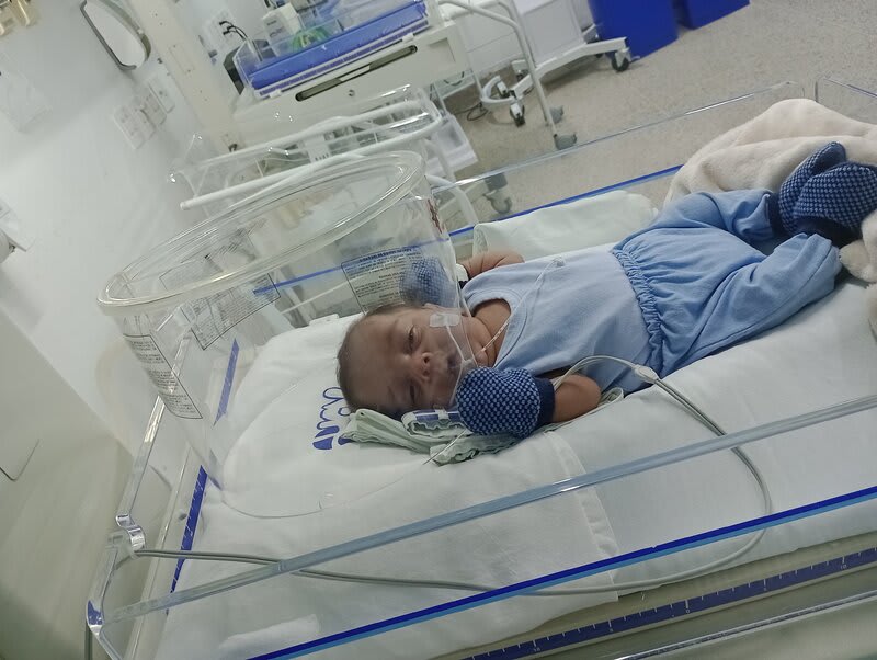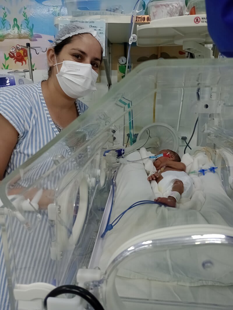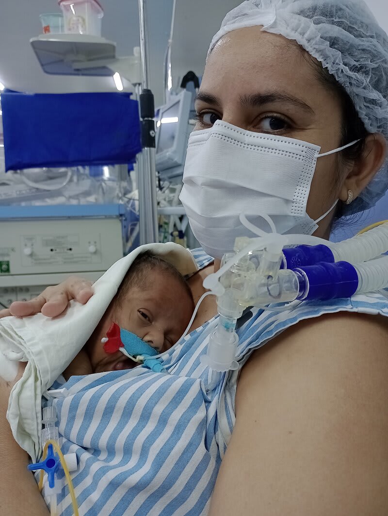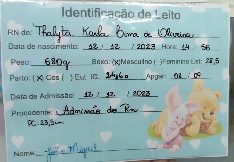 Com 20 semanas tive outro descolamento, meu coração estava em pedaços pois dessa vez o sangramento foi maior, mas fui para o hospital e lá vimos que João continuava lutando e continuava firme, desse dia até o dia 7 de dezembro fiquei imóvel contando os dias como se fosse uma eternidade e orando a Deus para que ele continuasse a obra que ele planejou. De madrugada tive uma hemorragia e tiveram que me transferir para a capital pois na minha cidade João teria nenhuma chance, aí começou a nossa luta pela vida. Cheguei no hospital com hemorragia e fui direto para a área vermelha do pré parto onde fiquei por três dias, ainda sangrando e perdendo líquido cada vez que eu fazia xixi. Me transferiram para outra sala onde fiquei até o dia 12, já estava sentindo muitas dores nos dias anteriores e rezando para que Deus segurasse João mais um pouquinho na barriga pois meu bebê teria pouquíssimas chances de vida se nascesse naquela semana. Também conversamos sobre a minha vida que também estava em perigo pois a hemorragia ainda estava forte. Mas no dia 12/12/2023 tive outra hemorragia e uma parada cardíaca em que tive que ir para a primeira sala de parto que tinha disponível naquela hora pois as nossas vidas estavam em perigo. Assim foi feito e às 14:56 do dia 12/12/2023 João Miguel nasceu e eu renasci, com 24 semanas e 6 dias, pesando 680 g e medindo 28,5 centímetros, foi direto para UTI neo onde ficou entubado por exatamente 3 meses e 10 dias, enfrentando 25 diagnósticos, baixo peso, hemorragia grau 1 na cabeça, inflamação no fígado, retinopatia da prematuridade, convulsão persistente, entre outras, foram exatamente 4 meses de UTI, depois foi transferido para UCIN onde começava a luta para desmamar do oxigênio.