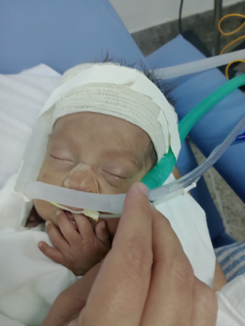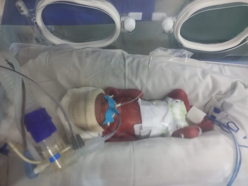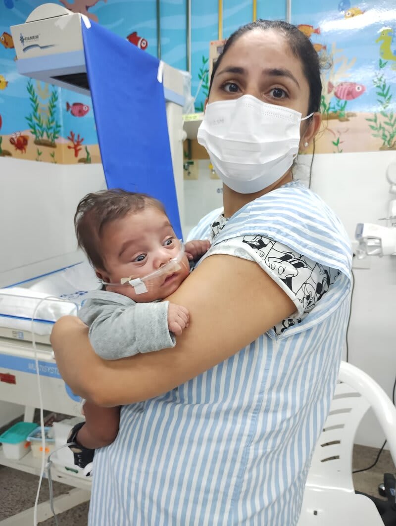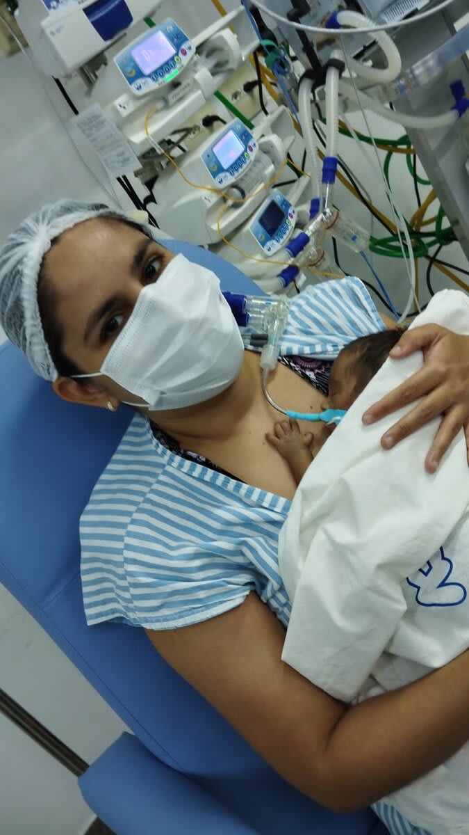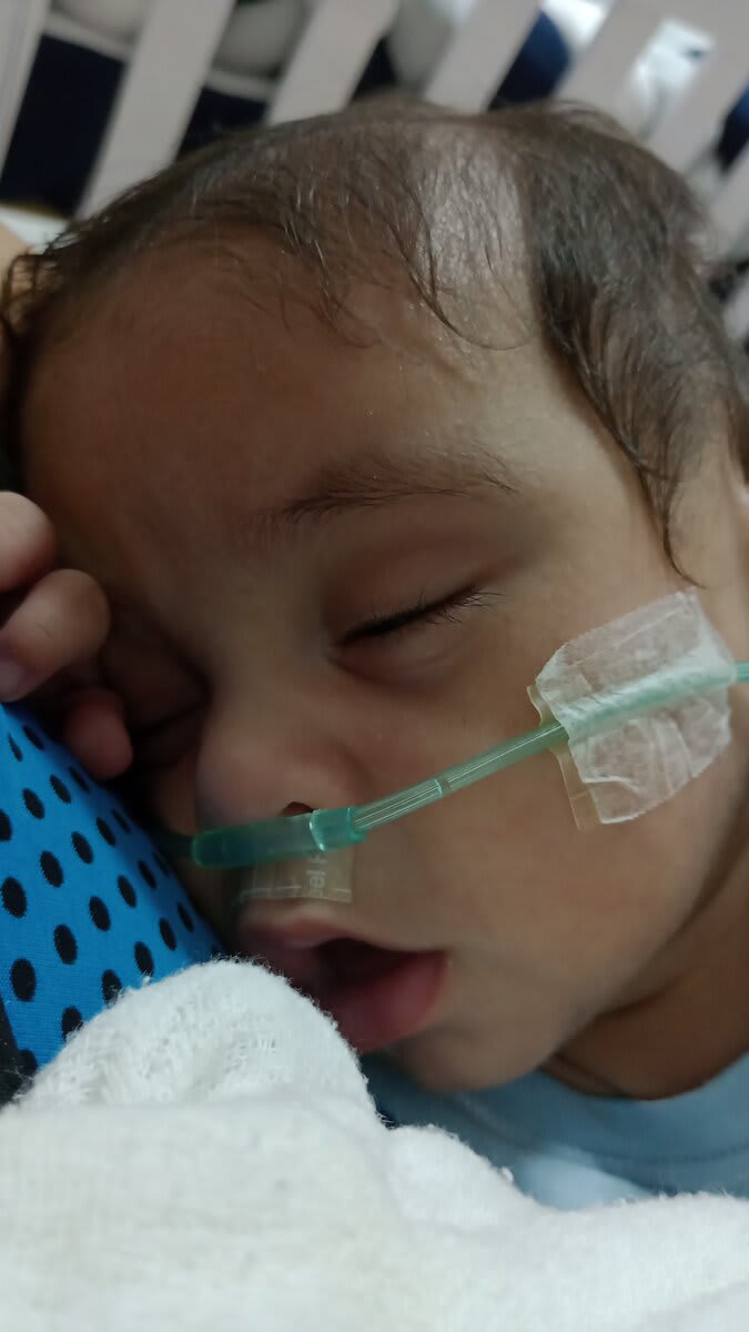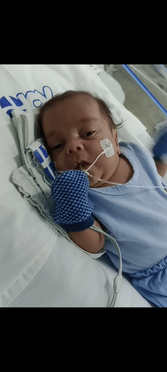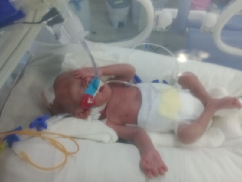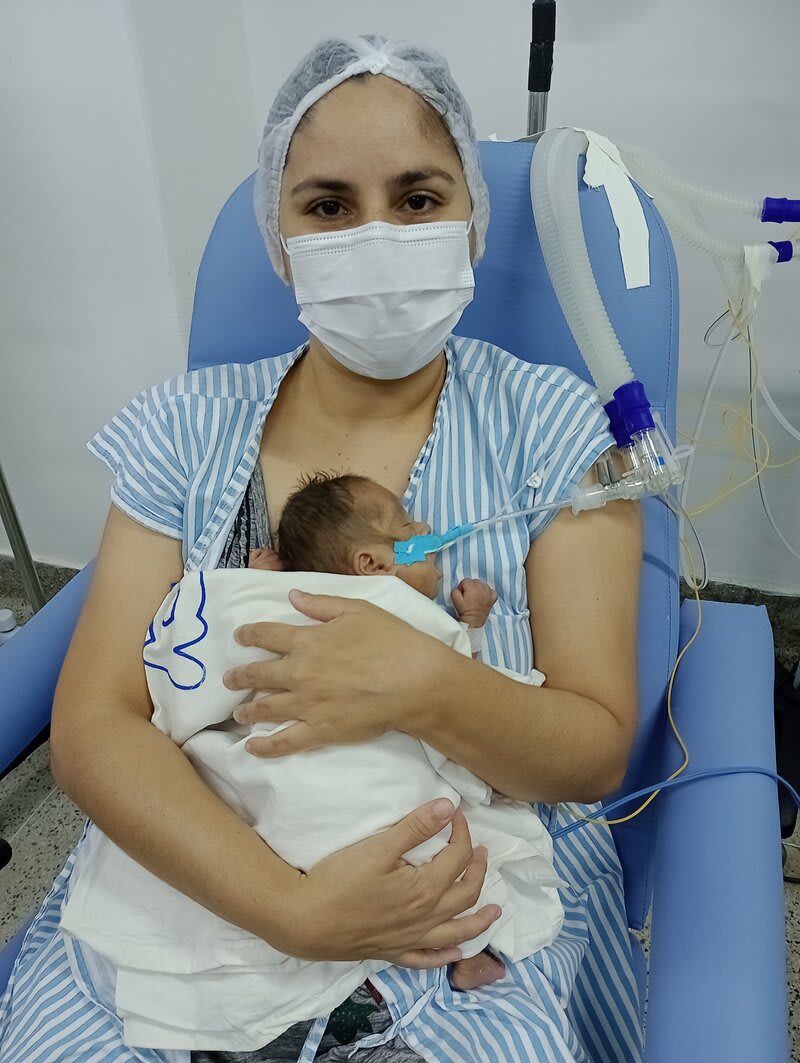 Com 20 semanas tive outro descolamento, meu coração estava em pedaços pois dessa vez o sangramento foi maior, mas fui para o hospital e lá vimos que João continuava lutando e continuava firme, desse dia até o dia 7 de dezembro fiquei imóvel contando os dias como se fosse uma eternidade e orando a Deus para que ele continuasse a obra que ele planejou. De madrugada tive uma hemorragia e tiveram que me transferir para a capital pois na minha cidade João teria nenhuma chance, aí começou a nossa luta pela vida. Cheguei no hospital com hemorragia e fui direto para a área vermelha do pré parto onde fiquei por três dias, ainda sangrando e perdendo líquido cada vez que eu fazia xixi. Me transferiram para outra sala onde fiquei até o dia 12, já estava sentindo muitas dores nos dias anteriores e rezando para que Deus segurasse João mais um pouquinho na barriga pois meu bebê teria pouquíssimas chances de vida se nascesse naquela semana. Também conversamos sobre a minha vida que também estava em perigo pois a hemorragia ainda estava forte. Mas no dia 12/12/2023 tive outra hemorragia e uma parada cardíaca em que tive que ir para a primeira sala de parto que tinha disponível naquela hora pois as nossas vidas estavam em perigo. Assim foi feito e às 14:56 do dia 12/12/2023 João Miguel nasceu e eu renasci, com 24 semanas e 6 dias, pesando 680 g e medindo 28,5 centímetros, foi direto para UTI neo onde ficou entubado por exatamente 3 meses e 10 dias, enfrentando 25 diagnósticos, baixo peso, hemorragia grau 1 na cabeça, inflamação no fígado, retinopatia da prematuridade, convulsão persistente, entre outras, foram exatamente 4 meses de UTI, depois foi transferido para UCIN onde começava a luta para desmamar do oxigênio.
