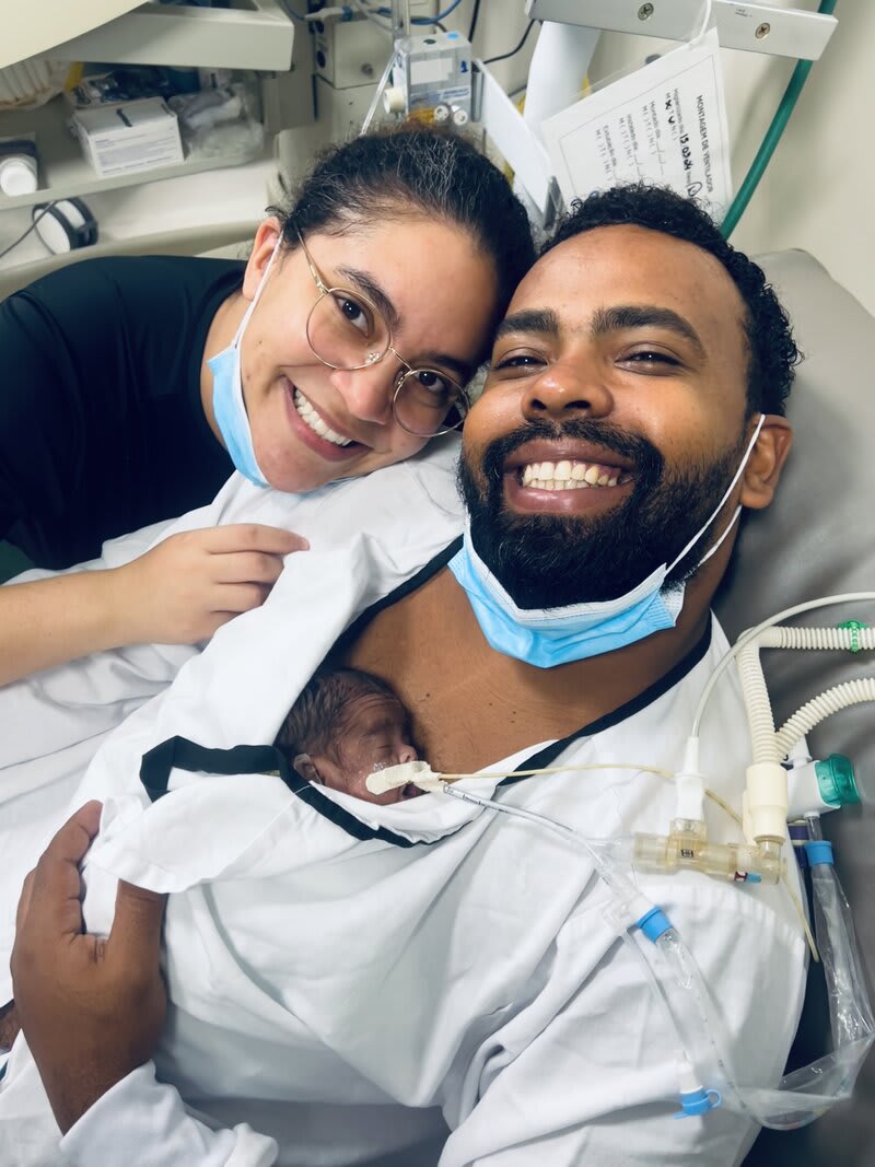 Fiz uma ultrassom e lá estava o Théo brincando com suas mãozinhas, fiquei internada naquela madrugada e no outro dia a noite senti muito frio e vomitei, a médica olhou e falou que eu já estava com 7 dedos de dilatação e teria que fazer o parto. Quando eu cheguei naquela sala gelada já olhei pro meu esposo e disse que o bebê não viveria, ele ficou desolado mas Deus me deu um alívio e tive meu parto normal (nunca quis) às 23:13 no dia 21/02/2024 chegou meu Théo pesando 730 gramas. No outro dia meu esposo me chamou para ver meu filho e eu não queria pois achei que ele não iria sobreviver porque já teve parada assim que nasceu, mas Deus estava presente e fez um milagre.