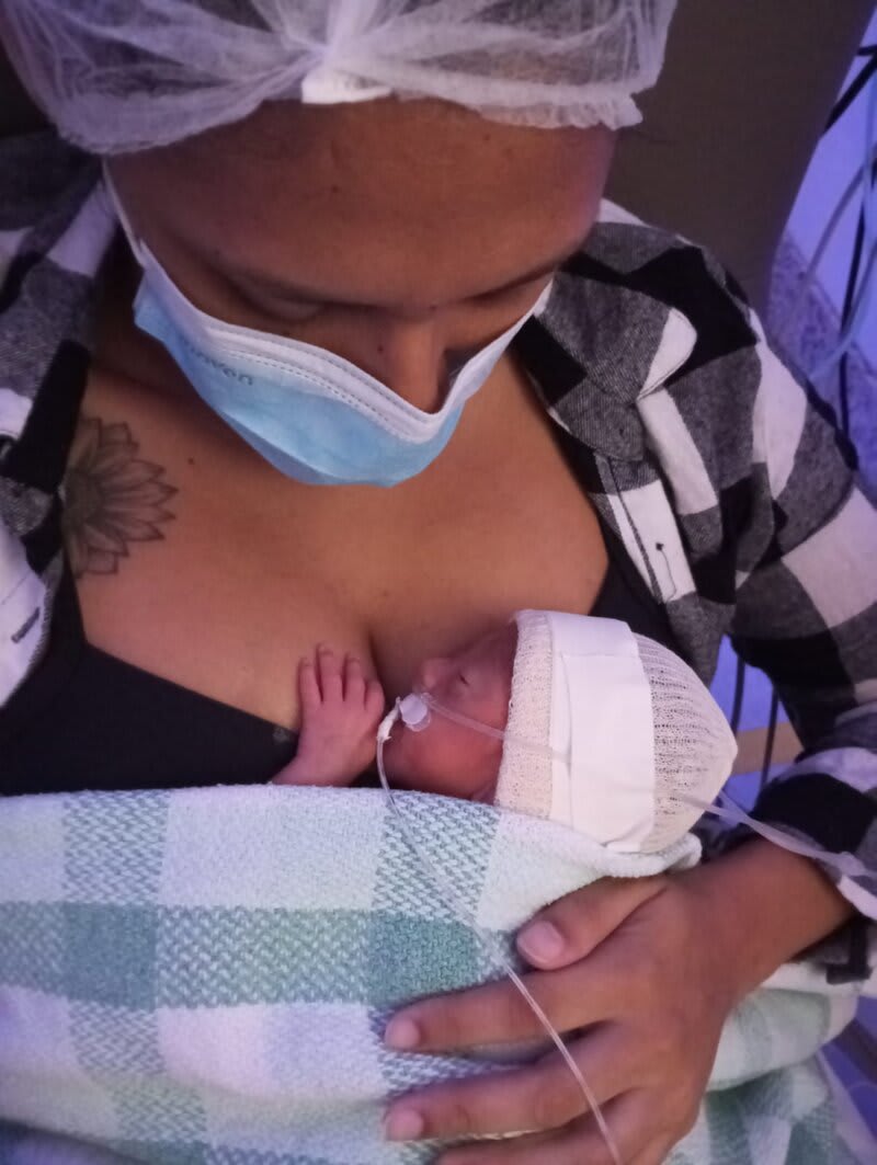Meu filho Ravi nasceu pesando 1kg290g, sem necessidade de intubação e permanecendo no CPAP sem complicações graves de prematuridade. Tive uma hemorragia durante o parto, que foi controlada com o uso de fórceps e suturas. Ravi ficou na UTIN por 30 dias para ganhar peso e se desenvolver adequadamente, recebendo alta em segurança. Após nossa saída da UTI neo, ficamos juntos no quarto para que Ravi se habituasse à amamentação e, após 36 dias, finalmente recebemos alta hospitalar. Apesar dos desafios, fomos para casa juntos, com Ravi saudável e em condições de receber o acompanhamento necessário.