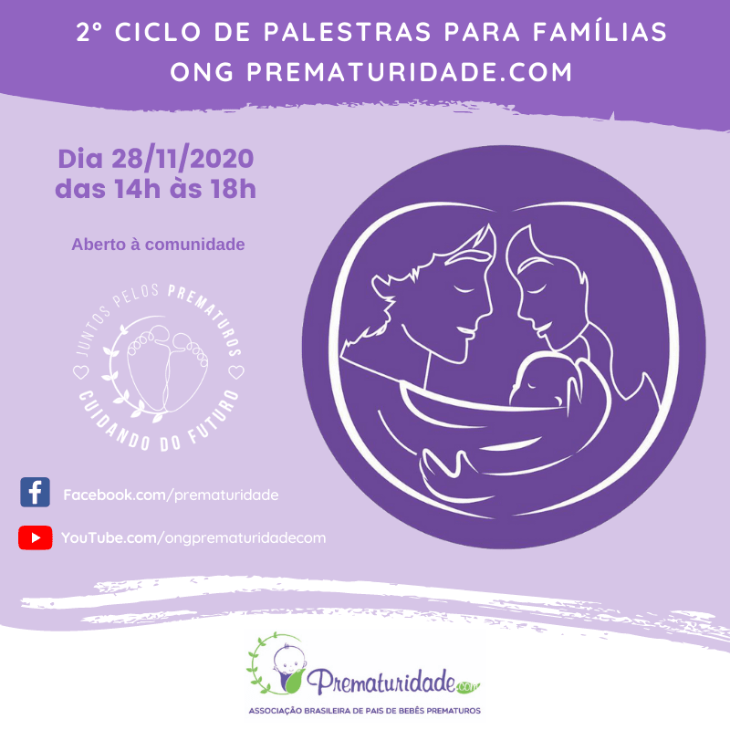 Para fecharmos o mês da prematuridade com muito amor, carinho e cuidados, pensando sempre no nosso slogan deste ano, teremos a segunda edição do Ciclo de Palestras para Famílias ONG Prematuridade.com. Esse evento têm como intuito reunir pais e famílias com profissionais da saúde para conhecer melhor os cuidados do bebê prematuro em uma linguagem mais clara e objetiva.