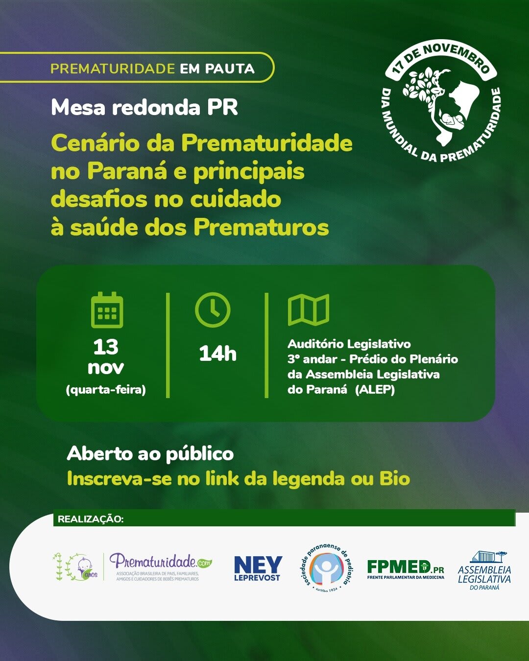 O slogan da campanha deste ano de 2024 é: “Acesso a cuidados maternos e neonatais de qualidade em todos os lugares!”. O coordenador da Frente Parlamentar da Medicina e Odontologia, deputado Ney Leprevost (União Brasil), comentou a respeito da proposição da mesa redonda. “A prematuridade hoje no Brasil é a principal causa de óbitos em crianças menores de 5 anos de idade, e infelizmente, também, muitas gestantes perdem a vida por causa da prematuridade. Por isso, estamos fazendo uma mesa redonda aqui a pedido das instituições que representam a pediatria no estado do Paraná, para divulgar e conscientizar a população sobre essa questão e também para recolher ideias de projetos que nós iremos protocolar aqui na Assembleia Legislativa, possibilitando que as pessoas possam ter um tratamento adequado e de maior qualidade para, justamente, evitar o falecimento de crianças e de gestantes”.