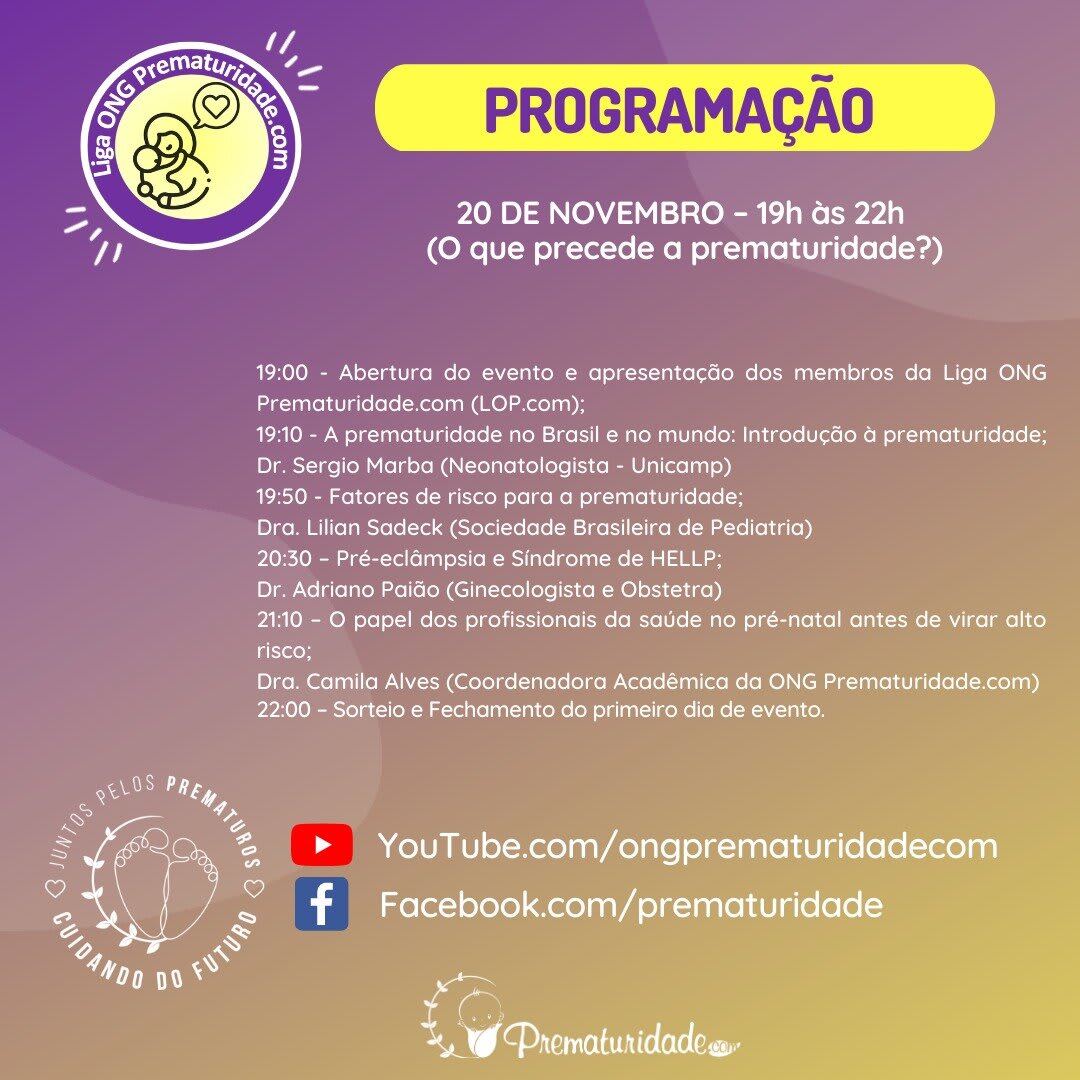 A ONG Prematuridade.com convida todos os acadêmicos e profissionais da saúde interessados em compartilhar experiências e agregar conhecimento para participarem do evento que ocorre no dia 20/11, das 19h às 22h, e no dia 21/11, das 8h às 14h30min, totalmente gratuito. Ao final, será enviado um certificado de participação.