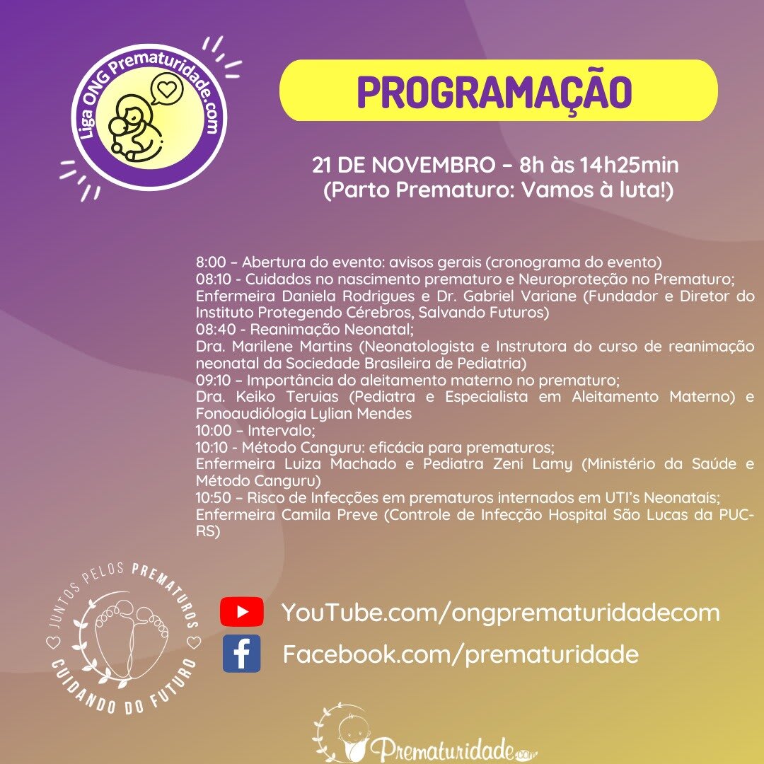 Venha conosco curtir esse momento especial, que contará com a participação de profissionais do território nacional, com expertise nas áreas de cuidados intensivos neonatais, cuidados à saúde materna durante o pré-natal, assistência ao binômio mãe-bebê durante o nascimento e o pós-parto, aleitamento materno, Método Canguru, imunizações, infecções em prematuros internados em UTI e Covid-19.