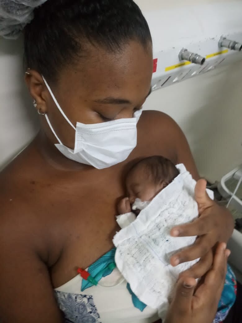 Com apenas 5 meses de gestação, descobri que estava com pré-eclâmpsia superajuntada e hipotireoidismo subclínico. Meu mundo mudou completamente. Fui internada e comecei a tomar vários remédios fortes para tentar controlar a pressão, mas ela continuava muito alta. Com o passar dos dias, meu estado piorou. Tive insuficiência renal, porque a pressão estava muito alta e meus rins já estavam sofrendo. Fiquei muito inchada. Depois de 18 dias internada, não teve mais jeito… Evelyn nasceu com apenas 710 gramas. Tão pequena, foi levada direto para a UTI neonatal, e eu nem pude segurá-la naquele momento. E não foi só ela… eu também fui para a UTI. Fiquei 4 dias lutando pela minha vida, enquanto minha filha lutava pela dela. Evelyn ficou 2 meses na UTI. Foram dias de muita fé, notícias difíceis, mas também de pequenas vitórias que significavam tudo. Depois, ela ainda precisou ficar mais 1 mês na enfermaria para ganhar peso e se fortalecer. Após a alta, nossa caminhada continuou. Foram anos de acompanhamento com especialistas, muitos exames, consultas e cuidados. E, mesmo hoje, com 5 anos, ela ainda precisa de acompanhamento por causa dos riscos da prematuridade.