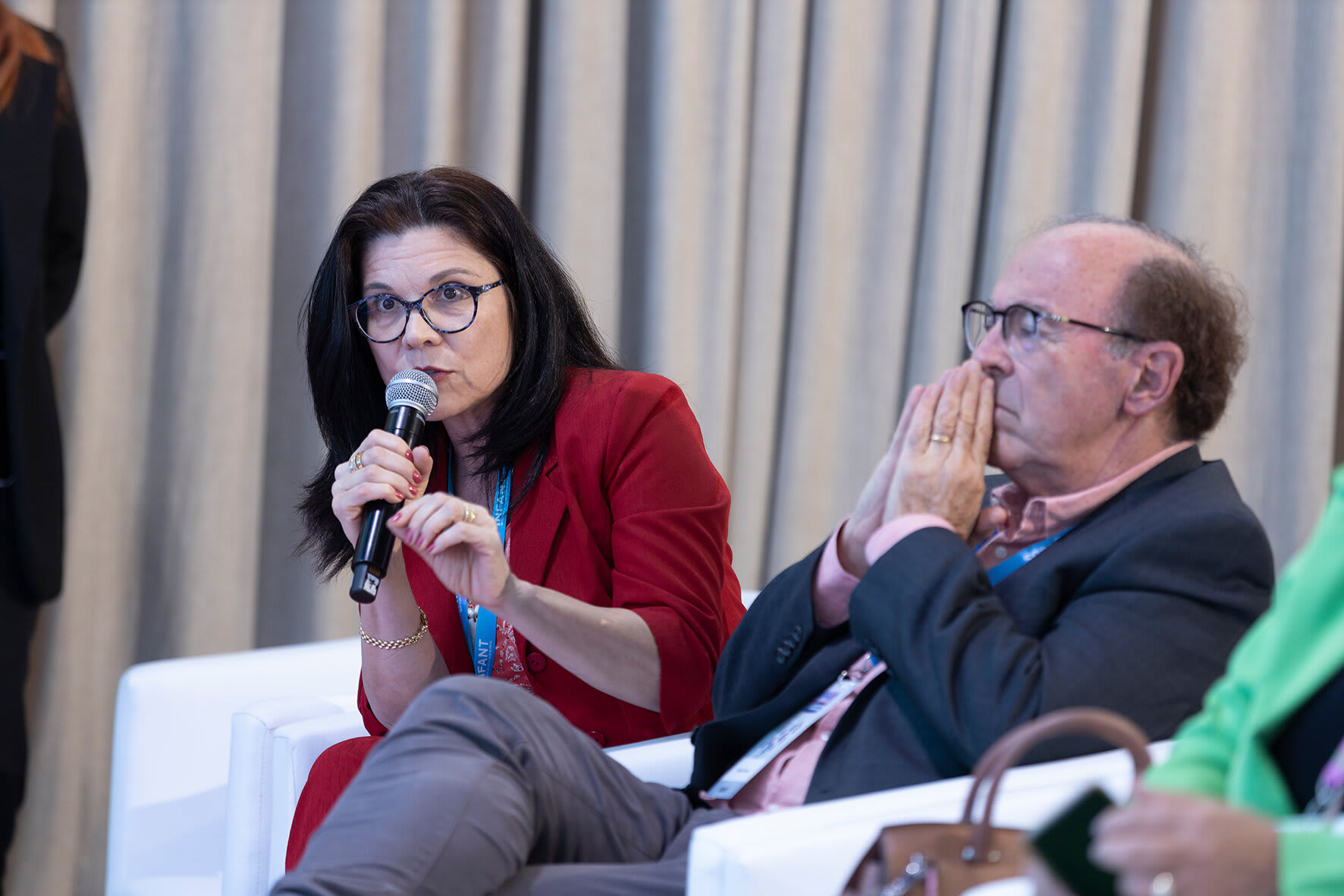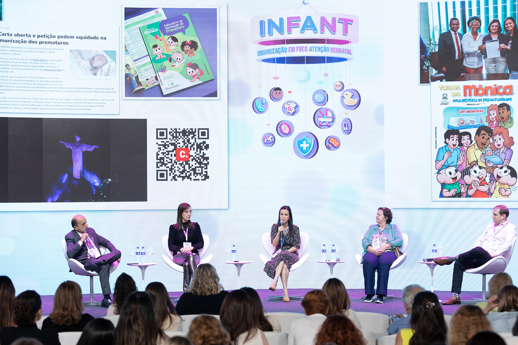 Denise Suguitani, diretora da ONG Prematuridade.com, participou da plenária principal do evento, junto à Dra Monica Levi, presidente da Sociedade Brasileira de Imunizações (SBIm), entidade parceira da ONG, Dra Lilian Sadeck, da Sociedade Brasileira de Pediatria e membro do nosso Conselho Científico e do Dr Daniel Jarovsky, da Santa Casa de São Paulo, mediados pelo querido Dr Renato Kfouri, também membro do nosso Conselho Científico. Denise abordou os desafios do cenário da prematuridade hoje no Brasil e o papel da sociedade civil organizada em busca de melhorias, com foco nas ações em busca de equidade na imunização dos bebês prematuros.