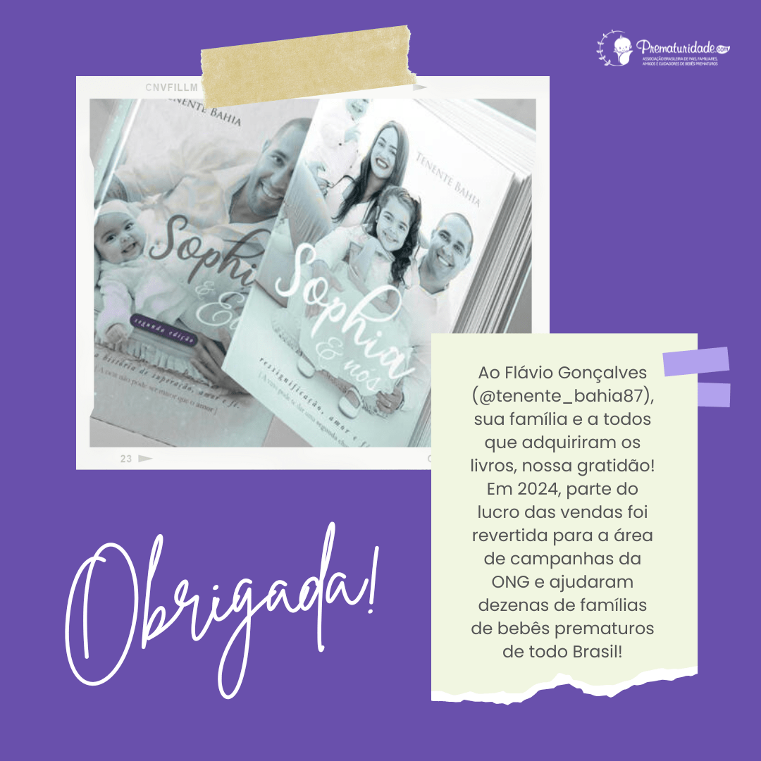 Durante 2024, parte do lucro das vendas dos livros que contam a história de Sophia, seu pai, Flávio Gonçalves, e sua família, Jéssyca e Henrique, foram destinadas à area de campanhas da ONG Prematuridade.com e ajudaram a apoiar a jornada de dezenas de famílias de bebês prematuros.