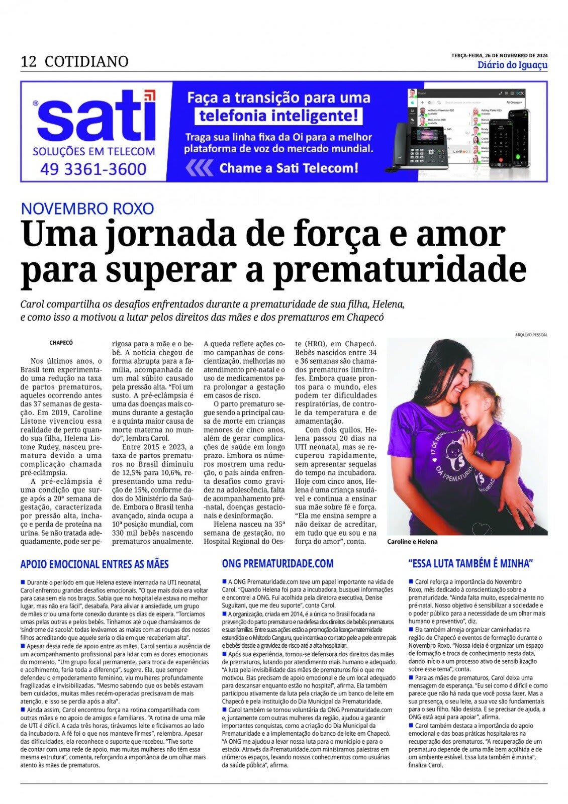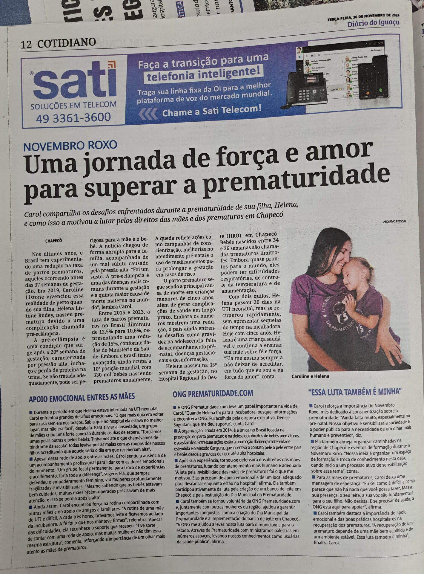 Carol, que participou ativamente da luta pela criação de um banco de leite em Chapecó e pela instituição do Dia Municipal da Prematurdidade, fala: "Quando a Helena foi para a incubadora, busquei informações e encontrei a ONG (...) a ONG me ajudou a levar nossa luta para o município e para o estado."