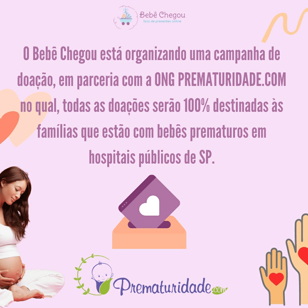Em iniciativa da loja Bebê Chegou com a Associação Brasileira da Pais, Familiares, Amigos e Cuidadores de Bebês Prematuros (ONG Prematuridade.com), está no ar um chá de bebê online solidário para campanha de doações, com 100% das doações arrecadadas destinadas às famílias com bebês prematuros e em situação de vulnerabilidade em hospitais públicos de São Paulo (SP).