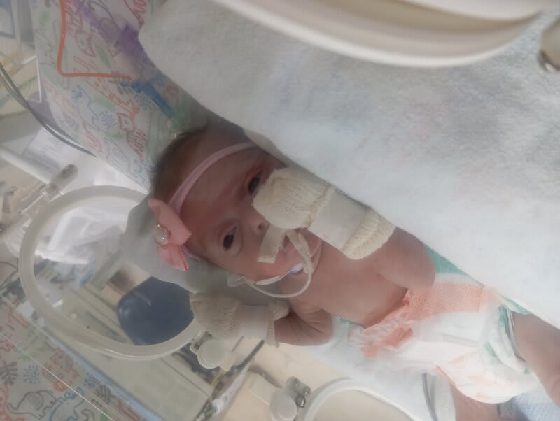 Marina nasceu de 26 semanas, pesando 985 gramas, devido a uma bolsa rota. Lutou por 70 dias na UTI.