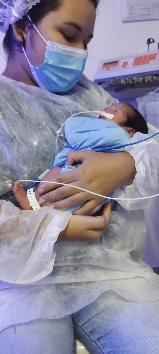 Eu tenho endometriose, então, quando descobri Dante foi uma alegria imensa misturada com medo por ser mãe de primeira viagem. Minha gestação foi bem tranquila, mas quando estava com 28 semanas e 3 dias no dia 24/03 comecei a sentir dores e a barriga endurecendo. Fui internada na madrugada do dia 25/03 e lá eles deram corticoides e alguns medicamentos. Como já cheguei com 8 dedos de dilatação às 10:11 do dia 26/03 meu lindo menino nasceu, pesando 1.400kg e medindo 40 cm. Quando vi ele por alguns minutos bem rápido meu coração se encheu de amor e também tive tanto medo. Dante ficou na UTI NEO durante 48 dias e no berçário médio risco durante 20 dias, dentro desse tempo no berçário precisou ir para Fortaleza realizar uma cirurgia com laser porque desenvolveu retinopatia da prematuridade. Meu grande milagre passou por diversos processos dentro desse tempo no hospital, mas no dia 5 de junho veio a tão sonhada alta e hoje está aqui no meu colo com 6 meses e cheio de saúde.