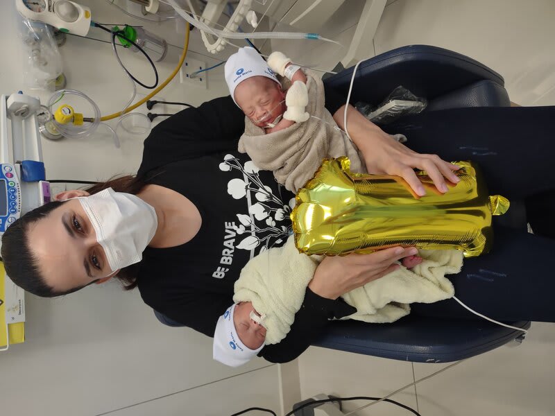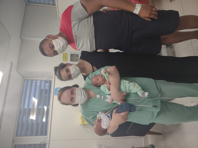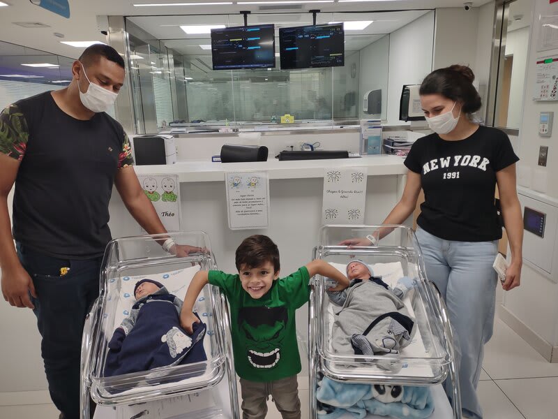 Estava tudo correndo muito bem em minha gestação, consultas tudo ok sem nada para se preocupar, quando no sábado tudo tranquilo dia 07/01/23 às 13:30, estávamos deitados descansando pois de tarde eu ia me encontrar com algumas amigas e senti algo estranho. Coloquei a mão e vi que era sangue, chamei meu marido que pediu que eu levantasse com calma, ao ficar em pé o sangue escorreu pelas minhas pernas, era muito sangue mesmo. Começou bater o desespero e o medo tomando conta de nós dois e ligamos para minha sogra e corremos para o hospital. Chegamos em 20 minutos de Itaquera até o hospital Santa Maria, ao ser atendida o médico não escutou o coração deles, ao me examinar saiu muito mais sangue no chão. O médico era super atencioso e ficou muito preocupado, corremos para a cesárea, foi tudo muito rápido e meu marido não viu o Brian nascendo, a placenta dele rompeu 90%, ele engoliu e aspirou sangue, nasceu às 14:07 e o Theo às 14:08. As primeiras horas do Brian foram muito delicadas, além de ser um prematuro extremo ele ainda tinha essa condição de ter engolido o sangue, mas o Senhor não nos desamparou em nenhum momento, cada dia era uma vitória para os dois, ganhando peso muito bem, comendo e aceitando o leitinho tanto no peito como na mamadeira. Até que chegou a tão sonhada alta dia 04/03/23, foram 56 dias em que meus meninos lutaram bravamente para estar junto conosco, sei que fomos escolhidos para presenciar um milagre tão lindo, sei que somos um milagre e hoje eles estão com mais de 5 kg e com 4 meses de vidinha e 2 de corrigida. Assustamos a todos ao chegar no hospital daquela forma, mas hoje podemos contar nossa história e lembrar de quão especial eles são.