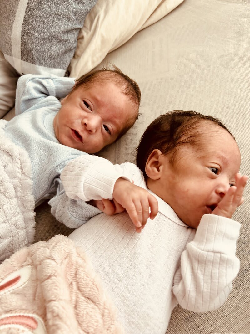 Tive uma gestação excelente até 20 semanas, quando tive dores muito fortes e sangramento, fomos para o hospital e por fim eu estava com contrações pois o colo do útero já tinha se dilatado todo e fiquei com uma das bolsas protusa (em cima da vagina). Aí começou nossa luta em tentar segurar o máximo os gêmeos dentro da barriga, me internei imediatamente e fiz repouso total, fiquei 31 dias internada com muitos medicamentos para parar o trabalho de parto e então conseguimos chegar nas 24 semanas e 6 dias de gestação, aí não teve mais como segurar, os gêmeos nasceram. Dia 07/07/24, Pérola nasceu primeiro com 710 g e 32 centímetros, Teodoro logo em seguida com 705 g e mesmo tamanho. Pérola foi direto para o CPAP, fez uma cirurgia com anestesia geral com 12 dias de vida porque ela perdia todos os acessos, então foi feito o acesso na jugular para receber todas as medicações. Ficou mais de 2 meses só no CPAP, depois oxigênio na incubadora e depois ficou em ar ambiente. Teodoro nasceu respirando, mas teve uma parada e precisou ser reanimado, o que surpreendeu os médicos, pois foi muito rápido. Teodoro nasceu mais fraquinho do pulmão então foi direto para o tubo.