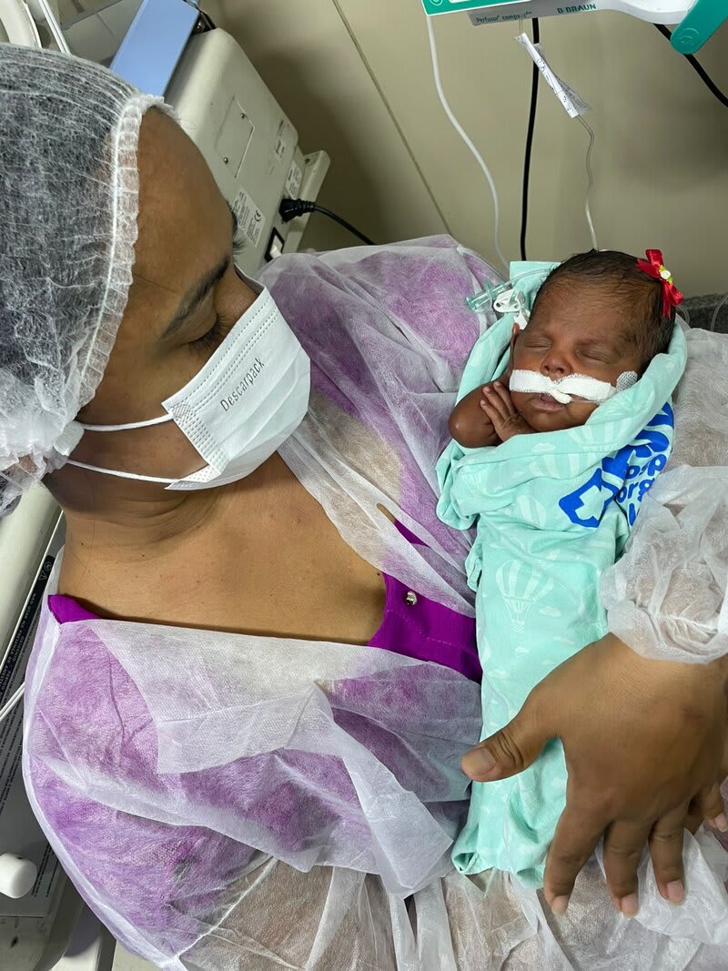 Meu bebê nasceu com 25 semanas e 4 dias, após um mês internada por incompetência ístmo-cervical. Meu milagre ficou 102 dias na UTI Neonatal, onde, após 30 dias, teve enterocolite. Passou por duas cirurgias, sendo necessária a realização de colostomia, que será revertida ao completar 1 ano de idade.