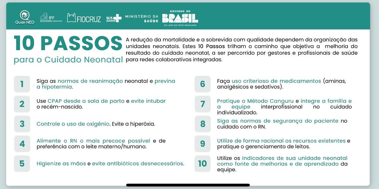 O guia completo “10 Passos para o Cuidado Neonatal” está disponível no Portal de Boas Práticas do IFF/Fiocruz. Além disso, a estratégia QualiNEO disponibiliza cursos de atualização e materiais educativos para equipes de saúde via Ambiente Virtual de Aprendizagem (AVA) do IFF/Fiocruz.