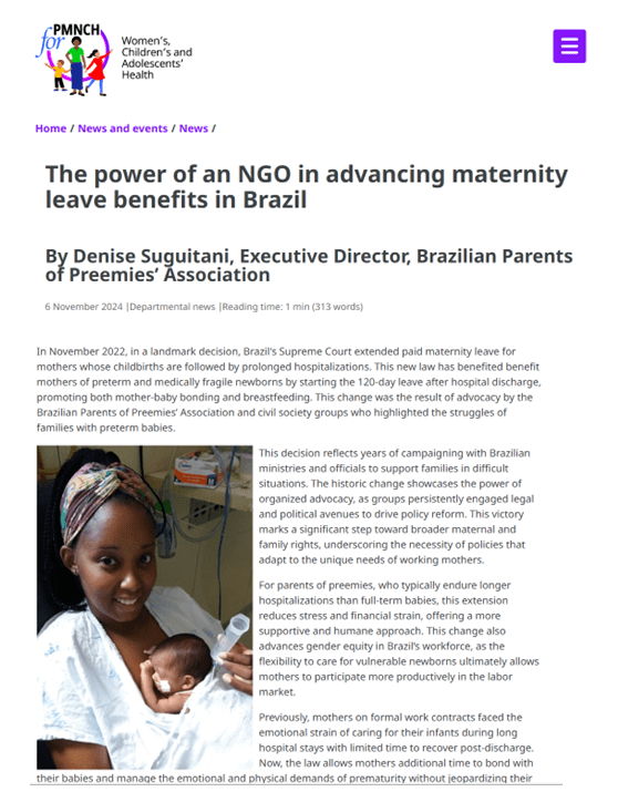 Em novembro de 2024, o artigo "The power of an NGO in advancing maternity leave benefits in Brazil", foi destaque no site da Partnership for Maternal, Newborn and Child Health (Parceria para a Saúde Materna, Neonatal e Infantil), a PMNCH, iniciativa da Organização Mundial da Saúde para a saúde das mulheres, crianças e adolescentes, da qual a ONG Prematuridade.com faz parte.