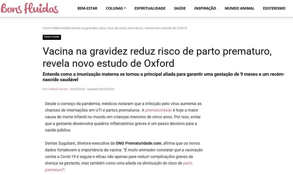 A ONG Prematuridade.com foi destaque em reportagem da revista Bons Fluidos sobre os benefícios da vacinação durante a gestação. A matéria aborda um estudo internacional conduzido pela Universidade de Oxford, que aponta que a imunização contra a Covid-19 pode reduzir o risco de complicações na gravidez, incluindo o parto prematuro.