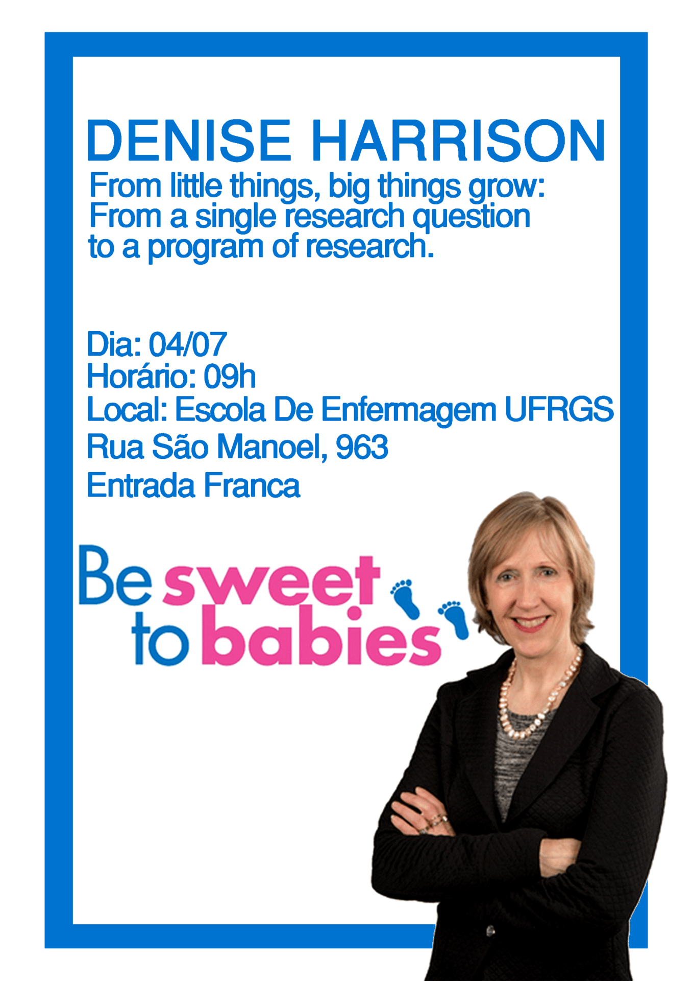 Denise Harrison é a líder e condutora das ações do projeto Seja Doce com os Bebês, iniciado no Canadá com seu grupo de pesquisa e aqui no Brasil conduzido por Mariana Bueno (USP), que pretende usar a mídia social para ajudar na redução da dor dos bebês prematuros. Conheça mais sobre o projeto aqui. No Rio Grande do Sul, a representante é a professora da UFPEL Ana Cláudia Vieira, que estuda a dor desde 2000 e realizou recentemente um estágio de pós-doutorado no Canadá. Ana conta que conheceu Denise através da Mariana, que por sua vez foi apresentada por Denise Gastaldo, professora em Toronto e que tem proporcionado uma rede de contatos para as enfermeiras brasileiras que desenvolveram seus estudos no país da América do Norte. Ela comenta ainda: "Quem reuniu todas nós foi a pesquisadora da Universidade de Toronto Bonnie Stevens. A primeira vez que fui ao Canadá para iniciar os estudos de dor, fui encontrar a Bonnie, criadora da escala PIPP (Perfil de Dor do Recém-nascido Prematuro), que foi atualizada e revisada recentemente. A Mariana Bueno também trabalha com ela e fez a validação da PIPP para o português do Brasil". Segundo Ana Cláudia, "temos uma capacidade de trabalho muito parecida e somos corajosas nessa luta para reduzir a dor das crianças, gostamos de trabalhar com os pais (eu sou Freiriana desde que nasci) e empoderá-los para cuidarem muito bem dos bebês. Somos entusiasmadas com o que fazemos e adoramos instigar os jovens estudantes para melhores práticas de cuidado em enfermagem neonatal e pediátrica. Enfim, amamos o que fazemos!".