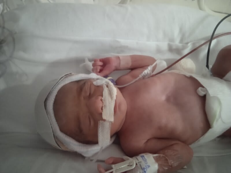 Ficou 24 dias apenas na UTI neo. Teve alta, enfim, faltando uma semana para completar um mês. Nasceu com 1480 g, 37 cm. Saiu de alta com 2050 g.